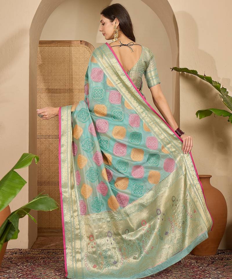 Women's blue organza zari woven saree with unstitched blouse piece