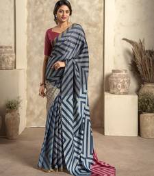 Women's blue satin crepe printed saree with unstitched silk blouse piece
