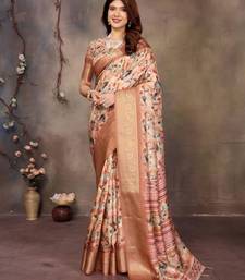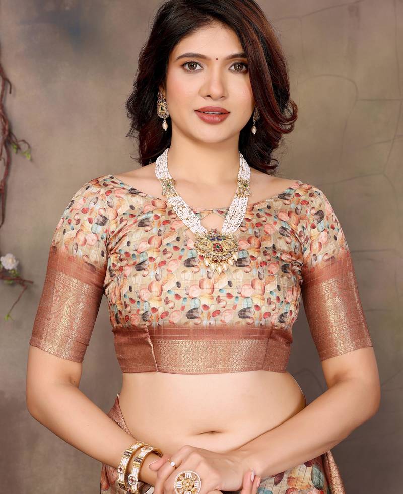 Women's cream dola silk blend digital print saree with unstitched blouse piece