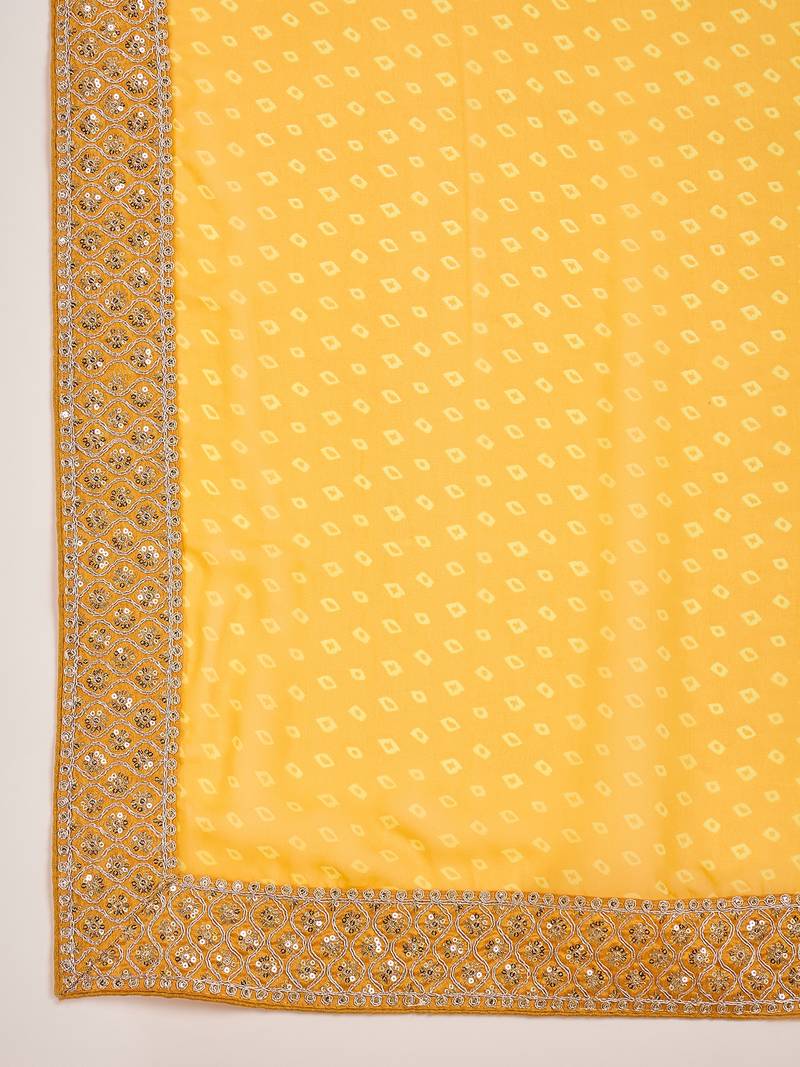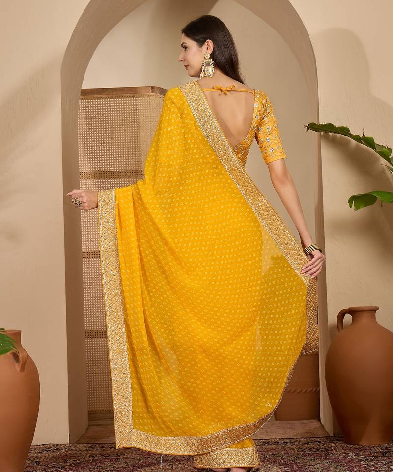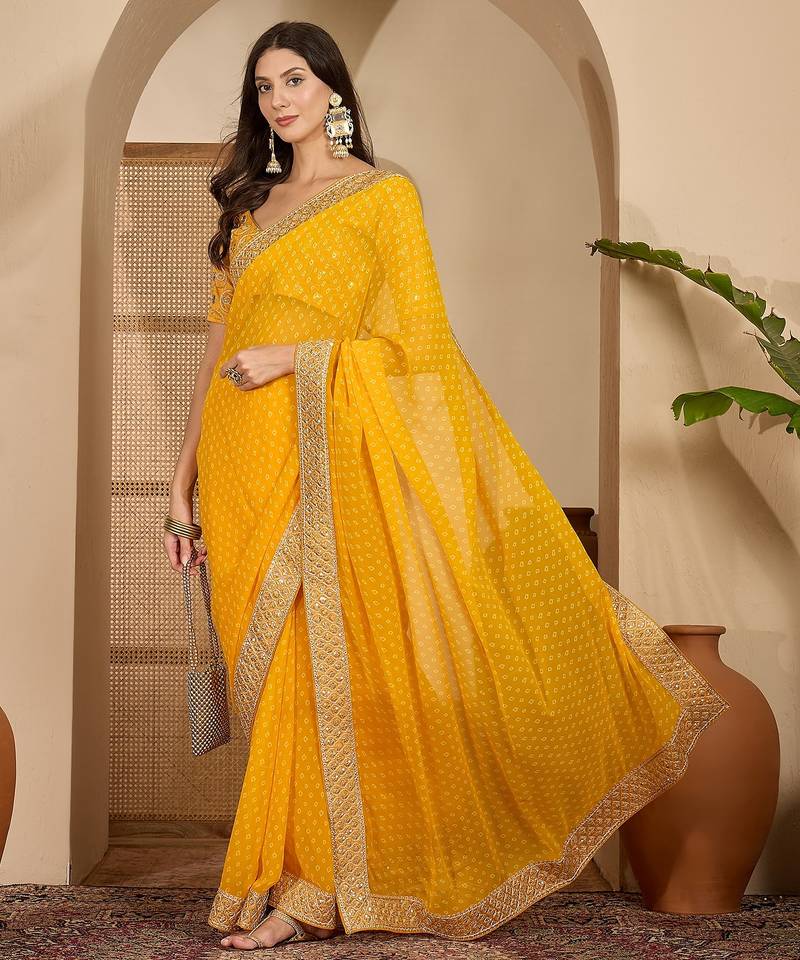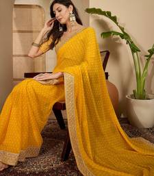Women's gold georgette bandhni saree with unstitched blouse piece