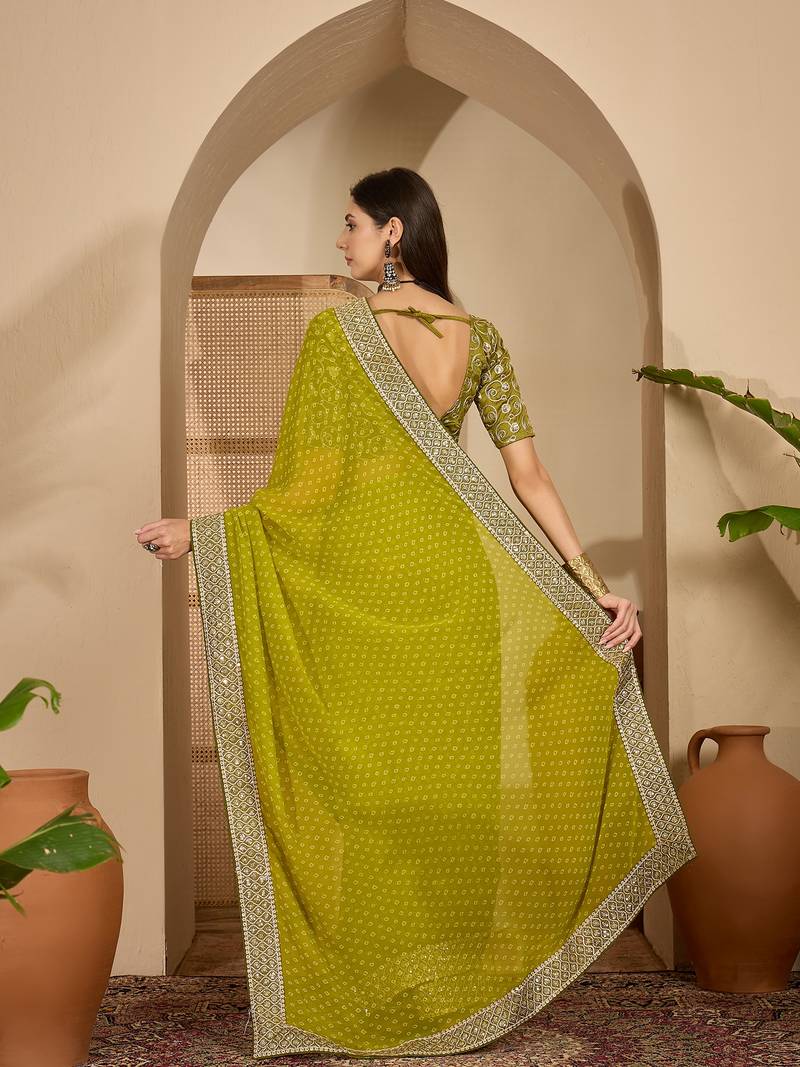 Women's green georgette bandhni saree with unstitched blouse piece
