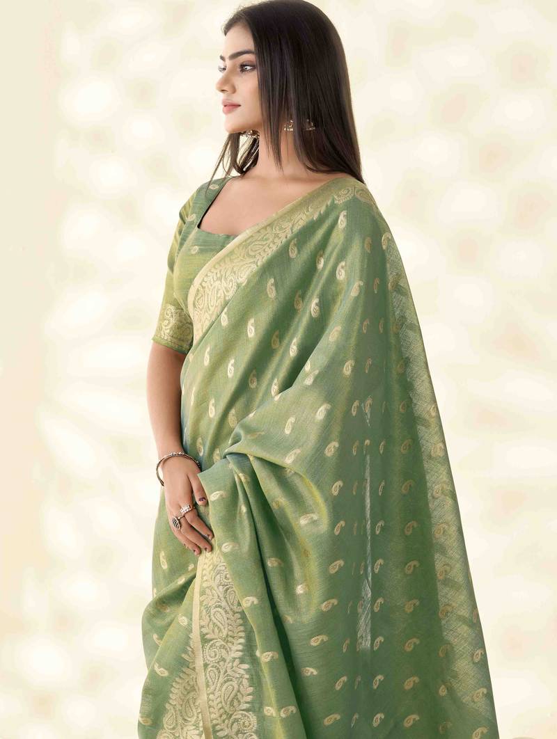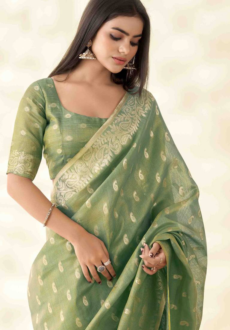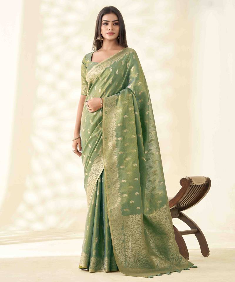 Women's green silk blend zari woven saree with unstitched silk blouse piece