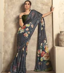 Women's grey satin crepe printed saree with unstitched silk blouse piece
