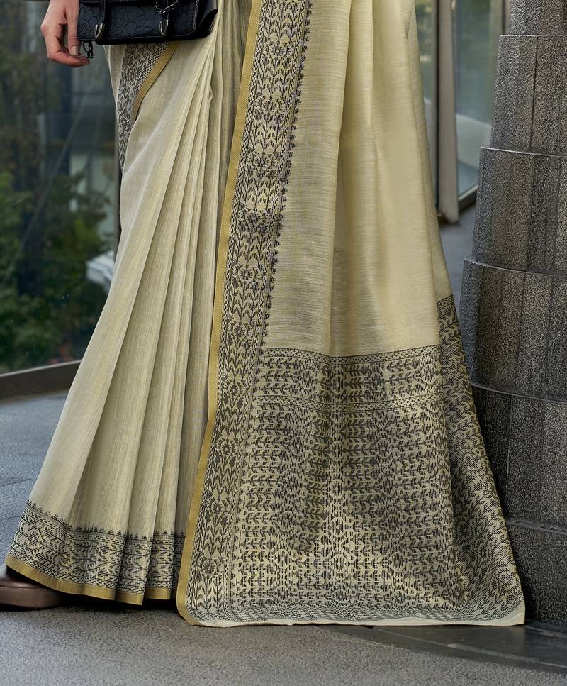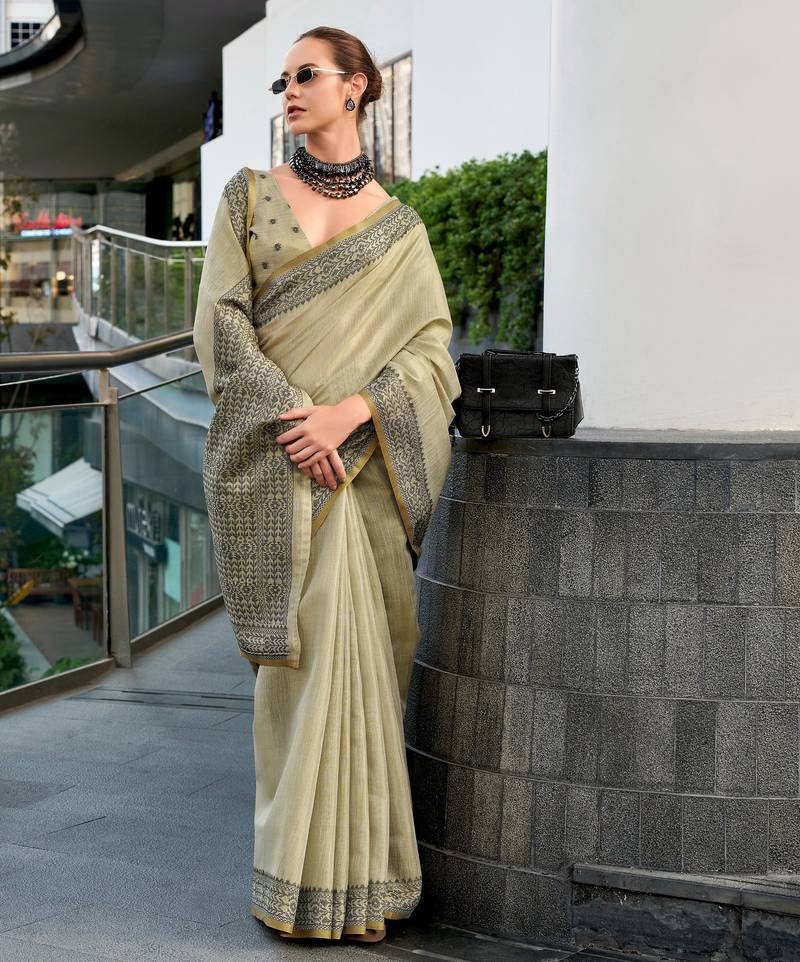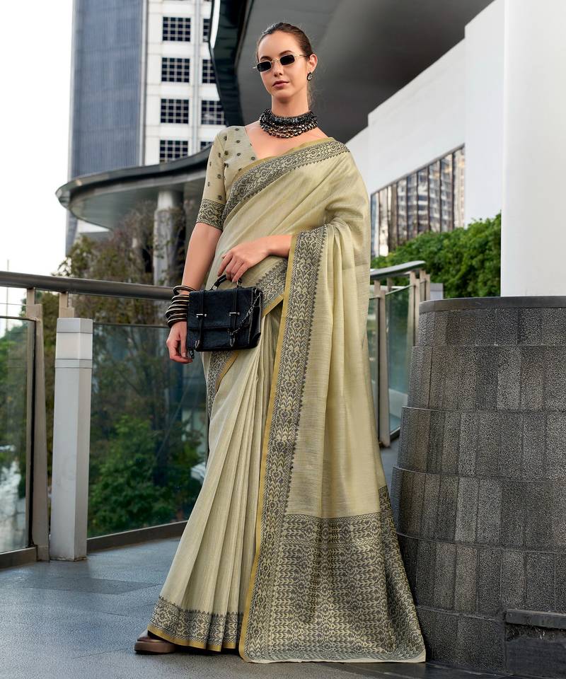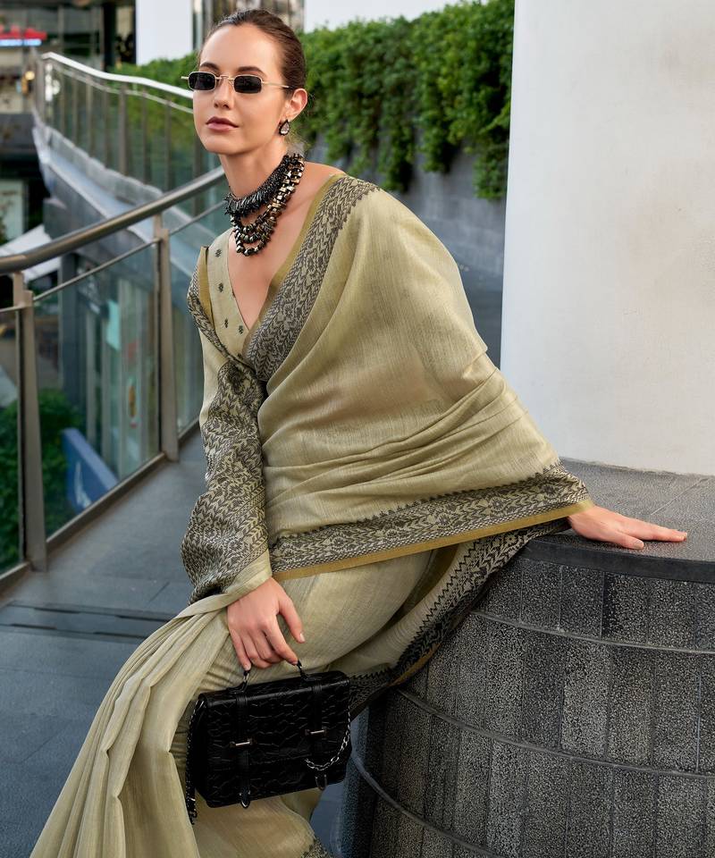 Women's khaki silk blend woven saree with unstitched silk blouse piece