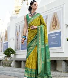 Neon soft ikat printed silk blend saree with unstitched blouse piece
