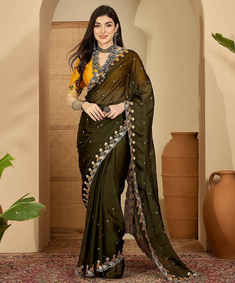 Women's olive chiffon embroidered saree with unstitched blouse piece