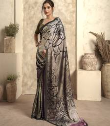 Women's olive satin crepe printed saree with unstitched silk blouse piece