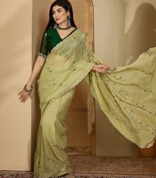 Women's pista chiffon embroidered saree with unstitched blouse piece