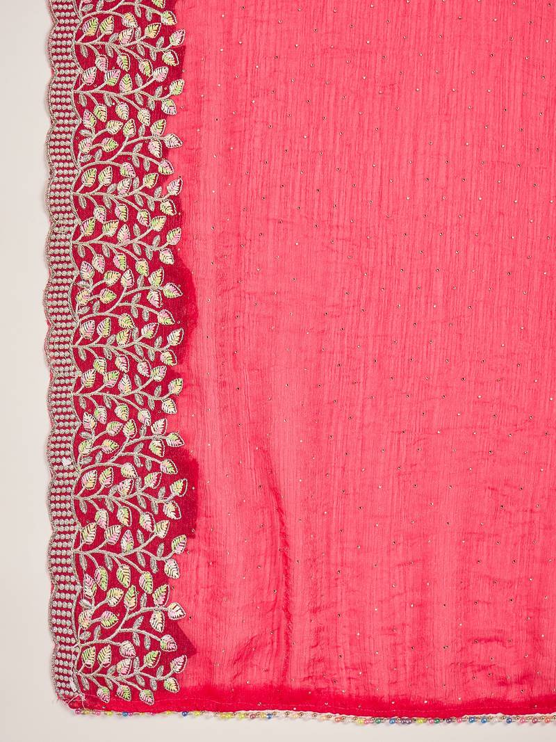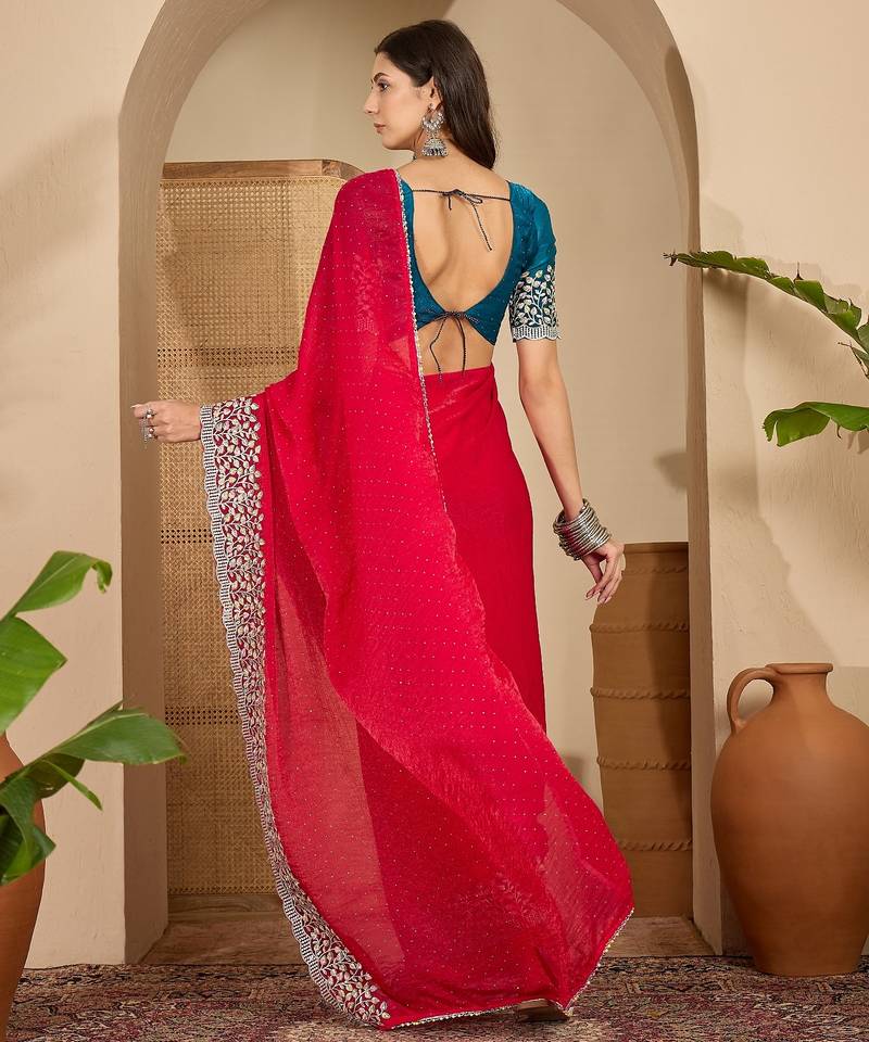 Women's rani silk blend chiffon embroidered saree with unstitched blouse piece