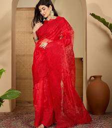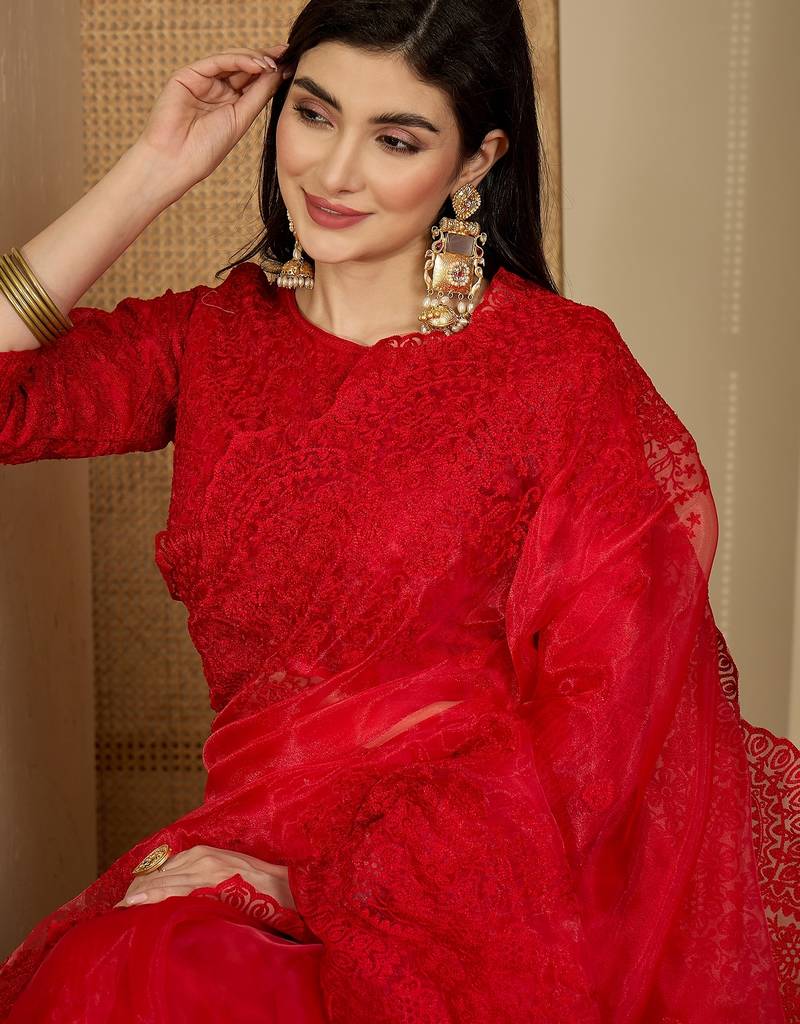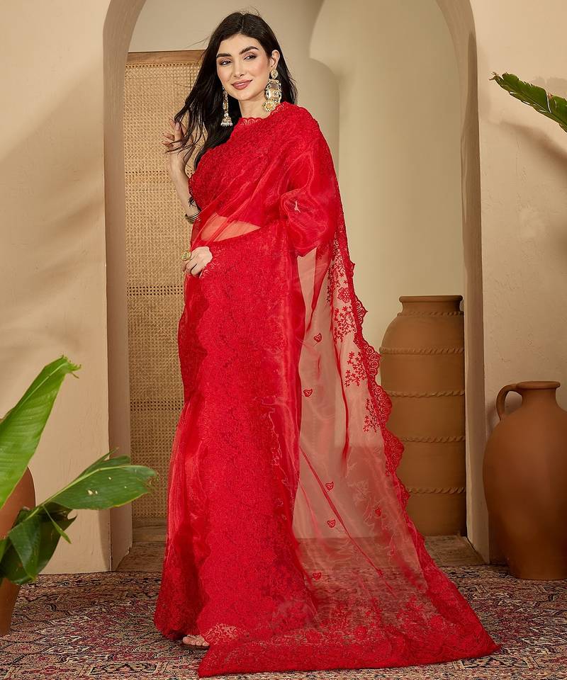 Women's red organza embroidered saree with unstitched blouse piece