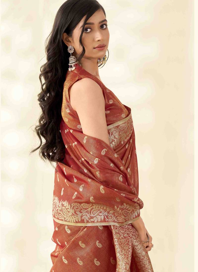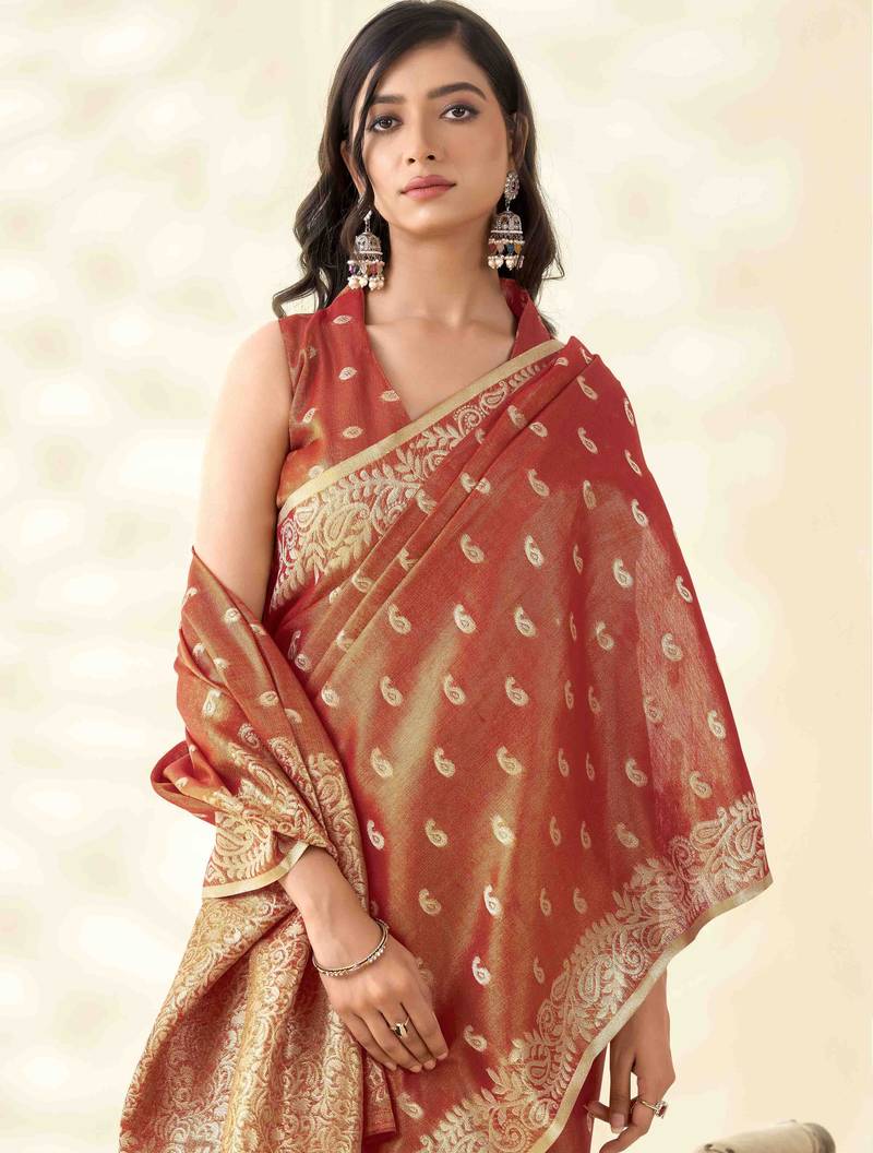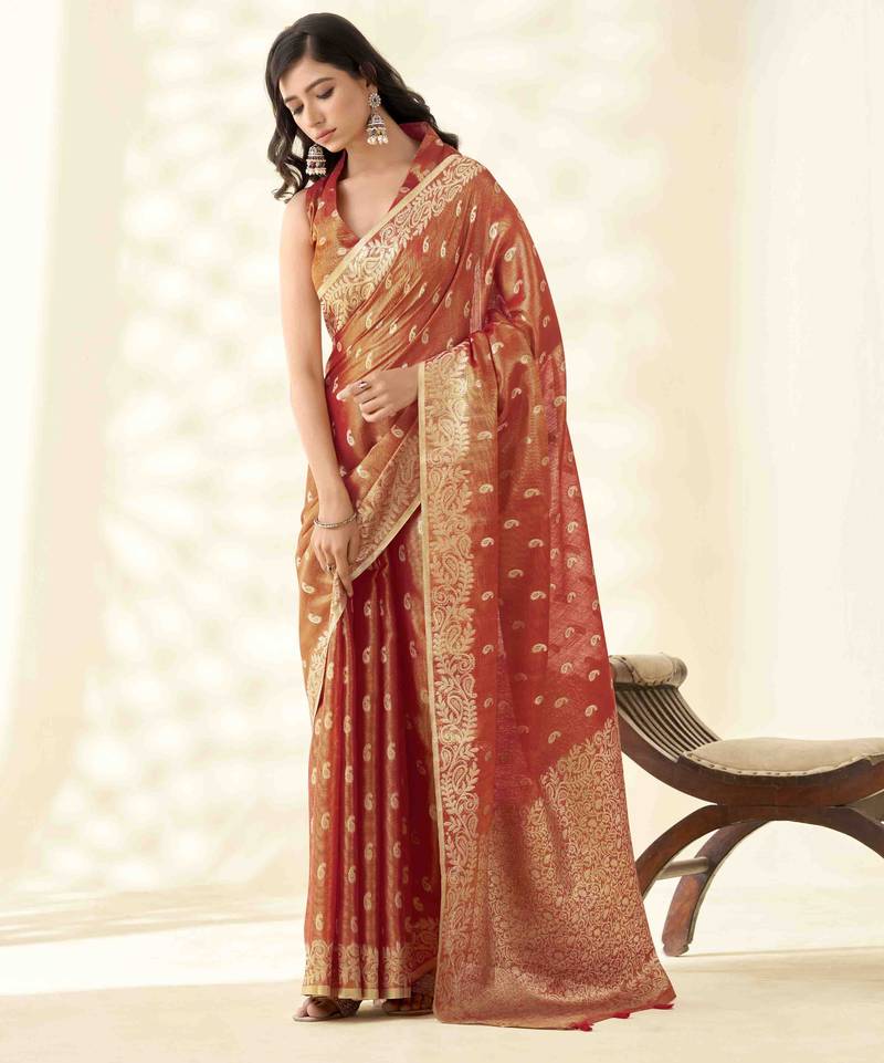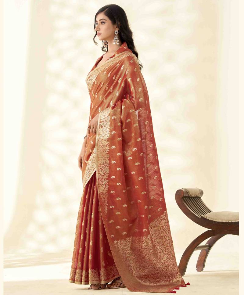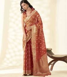 Women's rust silk blend zari woven saree with unstitched silk blouse piece