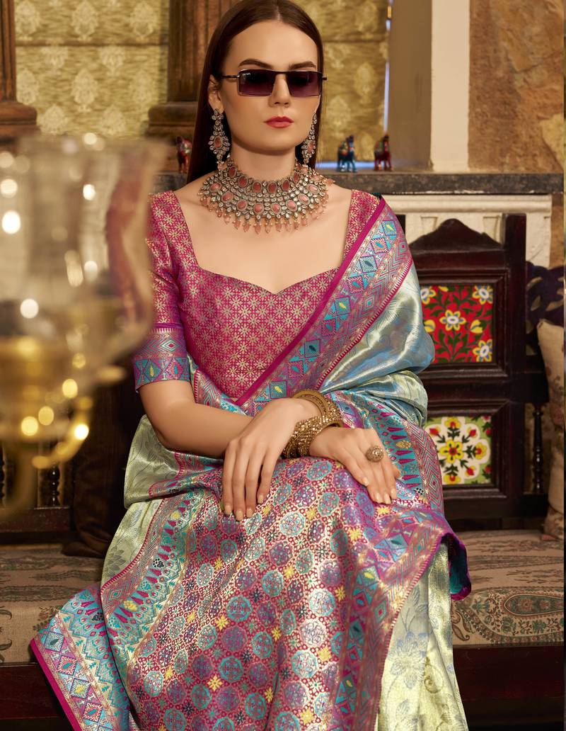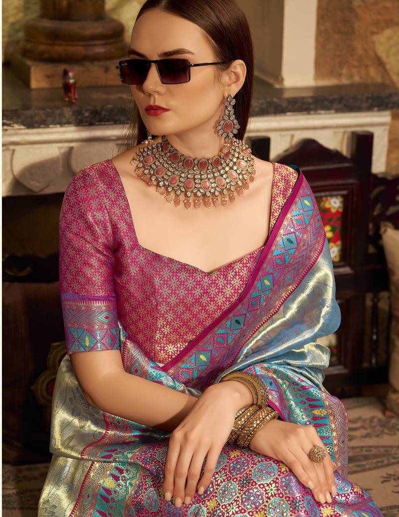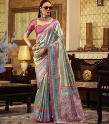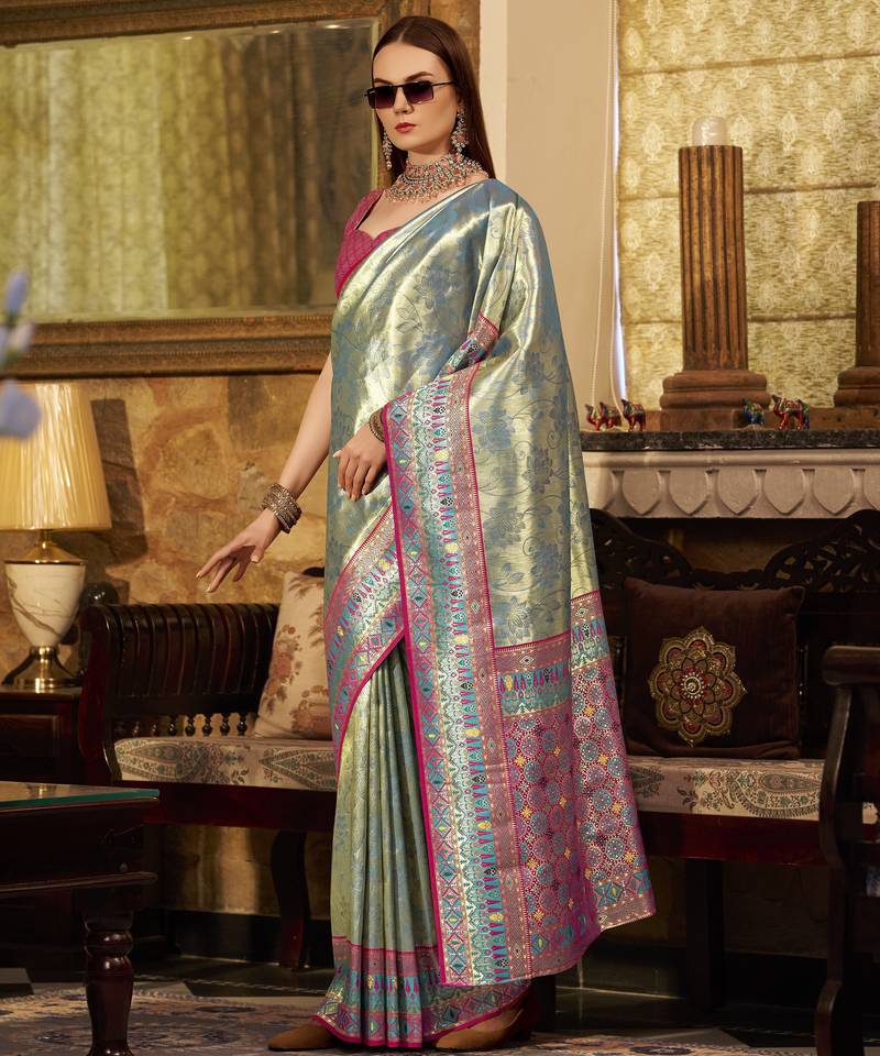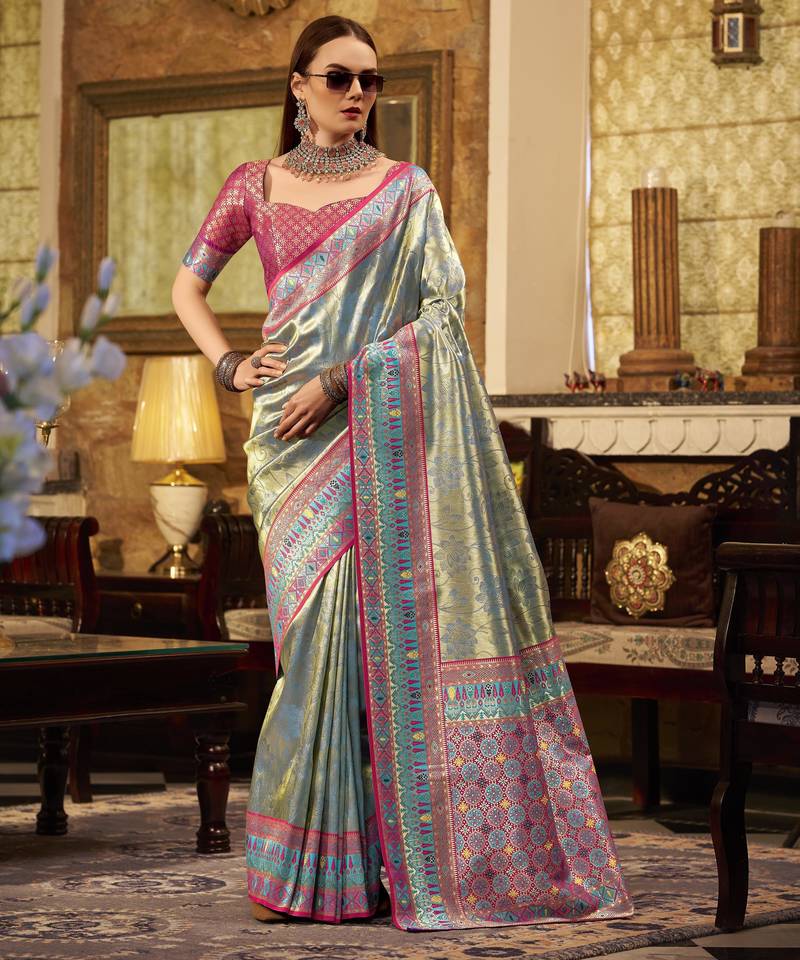 Women's turquoise tissue silk zari woven saree with unstitched silk blouse piece