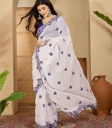 Women's white chiffon embroidered saree with unstitched blouse piece