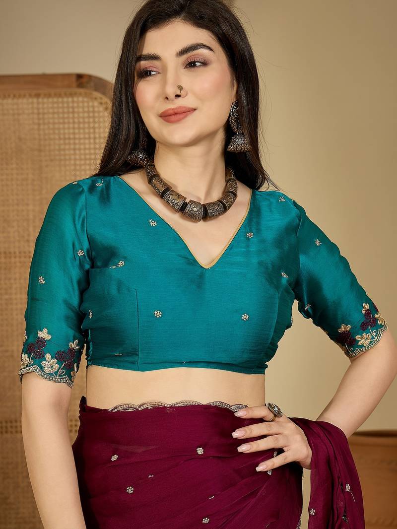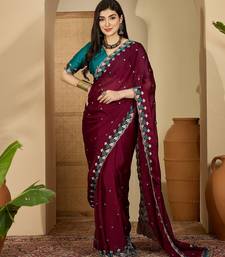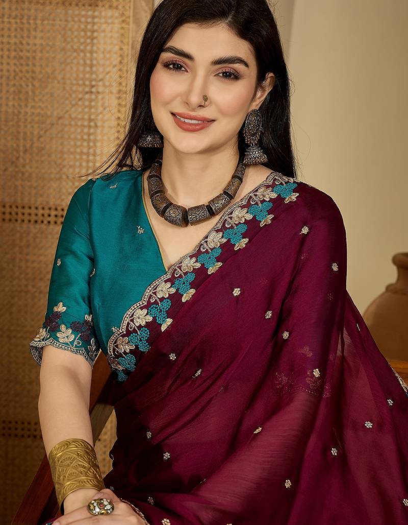Women's wine chiffon embroidered saree with unstitched blouse piece