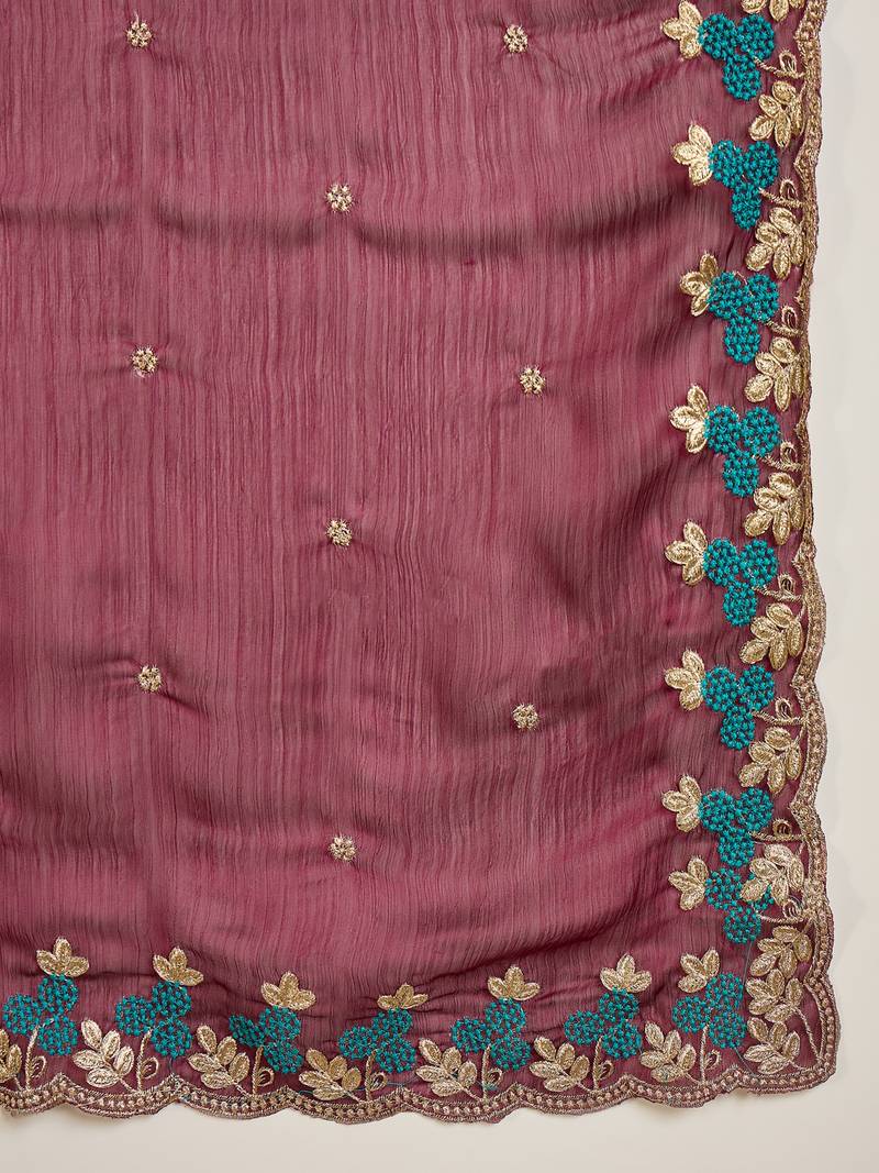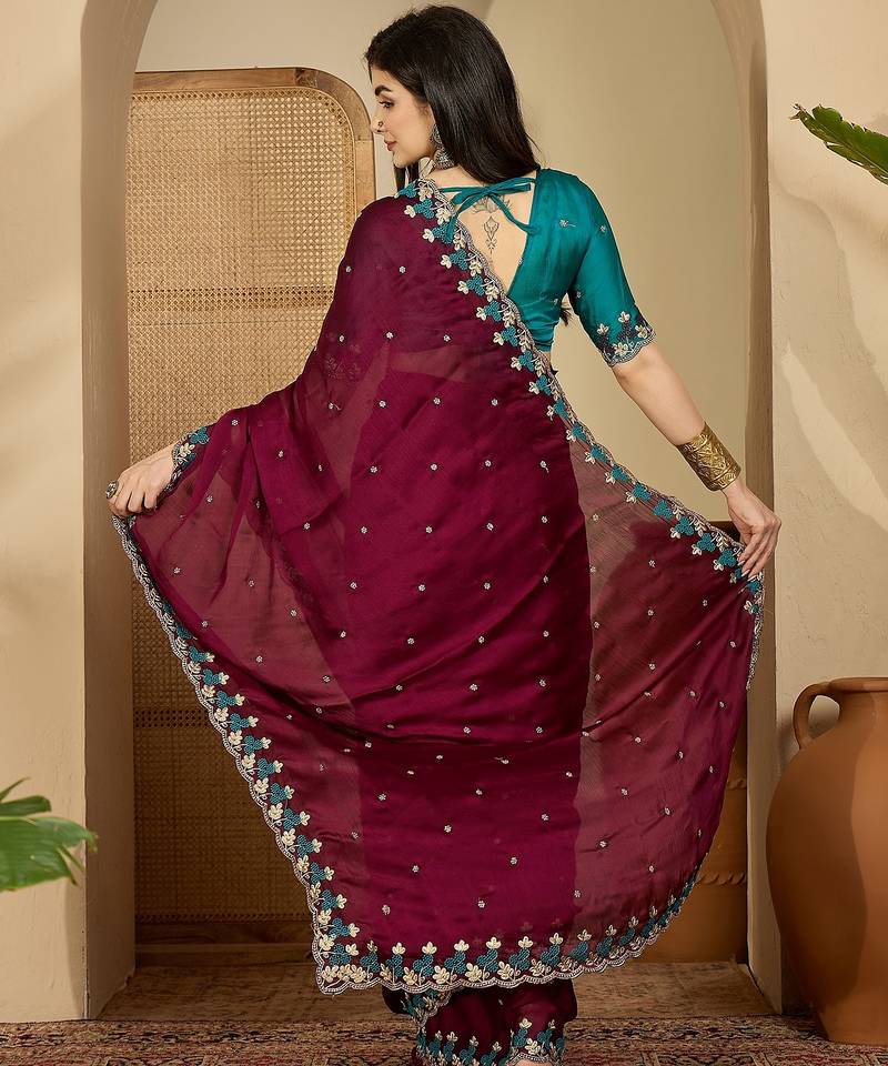 Product Name Women's Wine Chiffon Embroidered Saree With Unstitched Blouse Piece