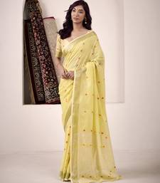 Women's yellow linen silk woven saree with unstitched silk blouse piece