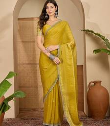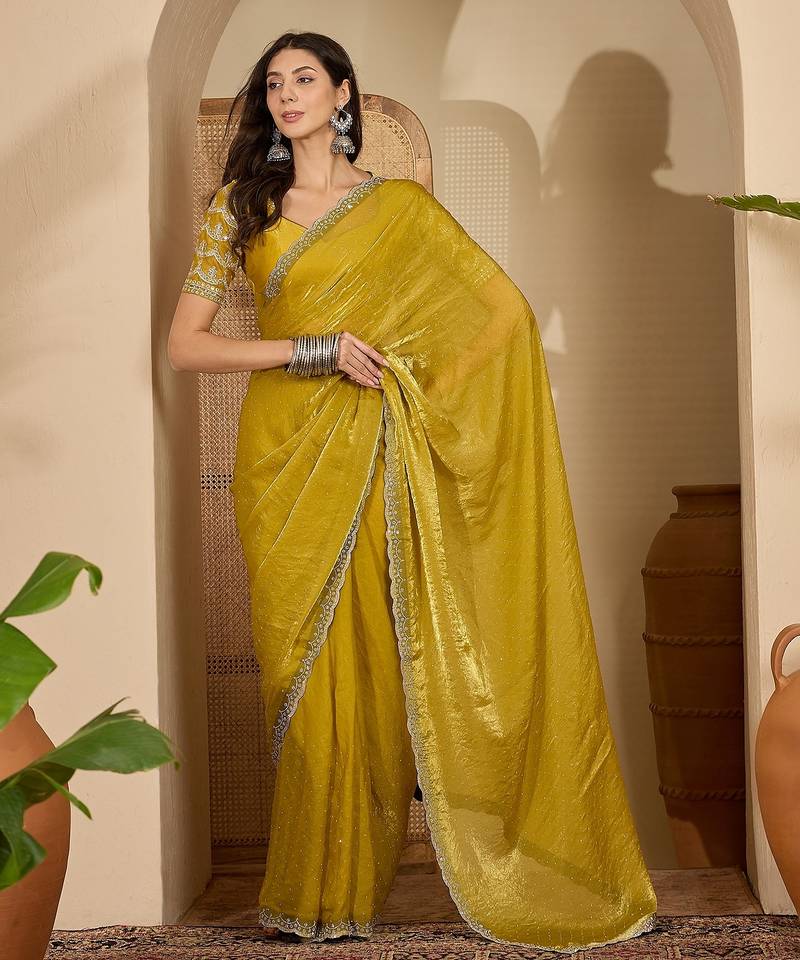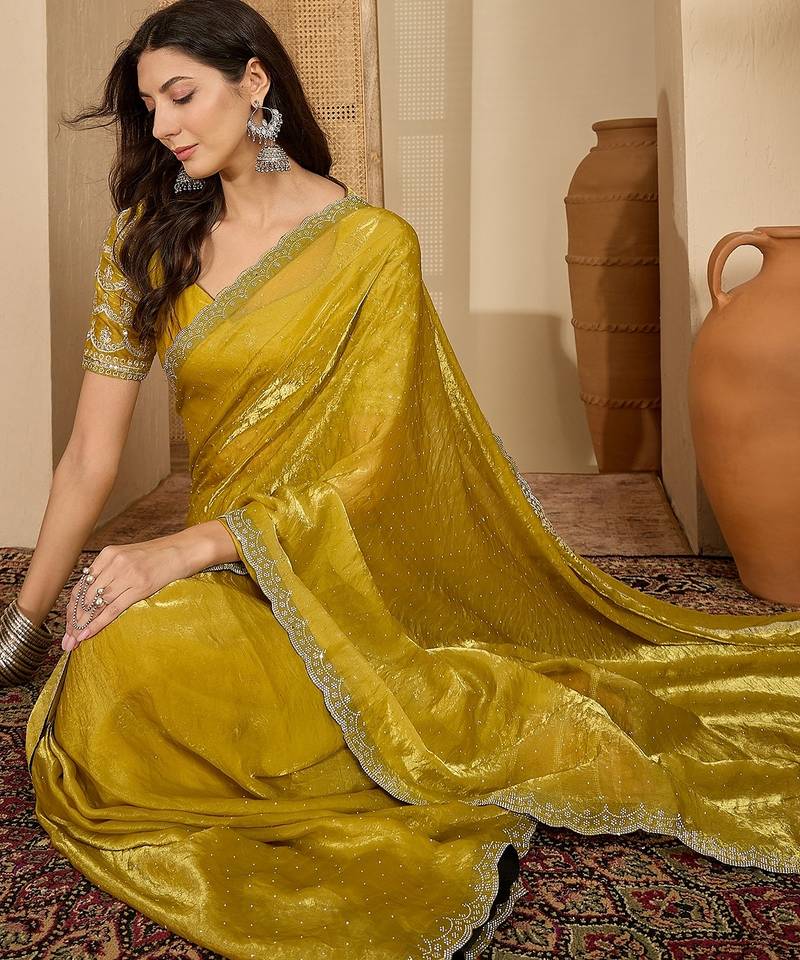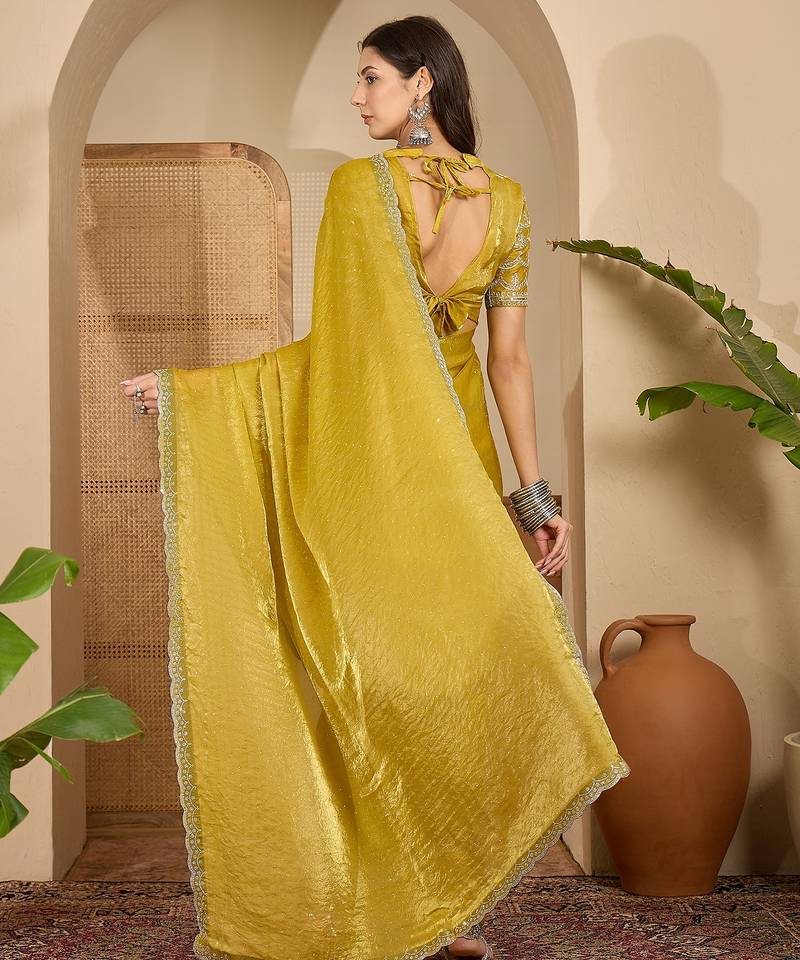 Women's yellow silk blend chiffon embellished saree with unstitched blouse piece