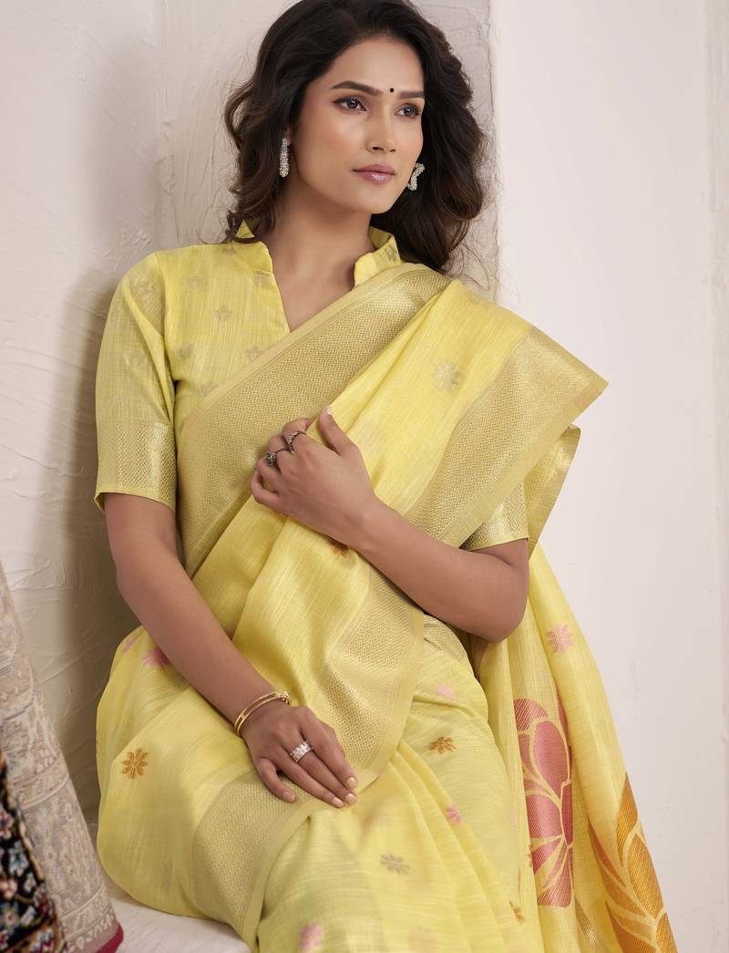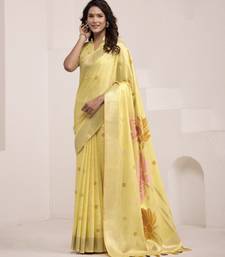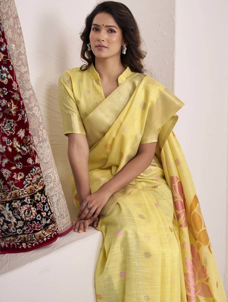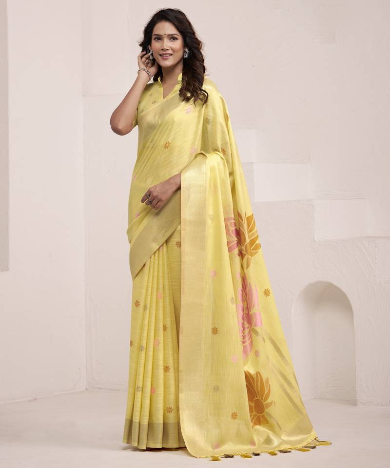 Women's yellow soft linen jacquard saree with unstitched silk blouse piece