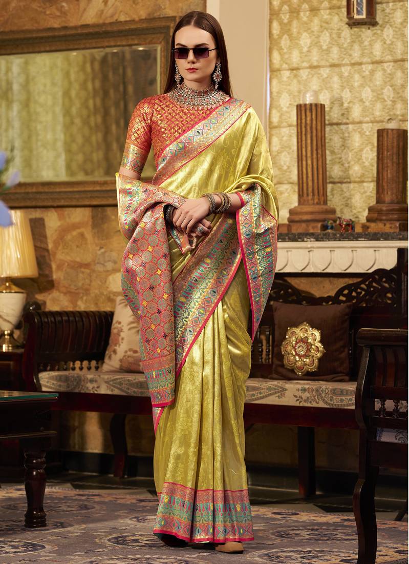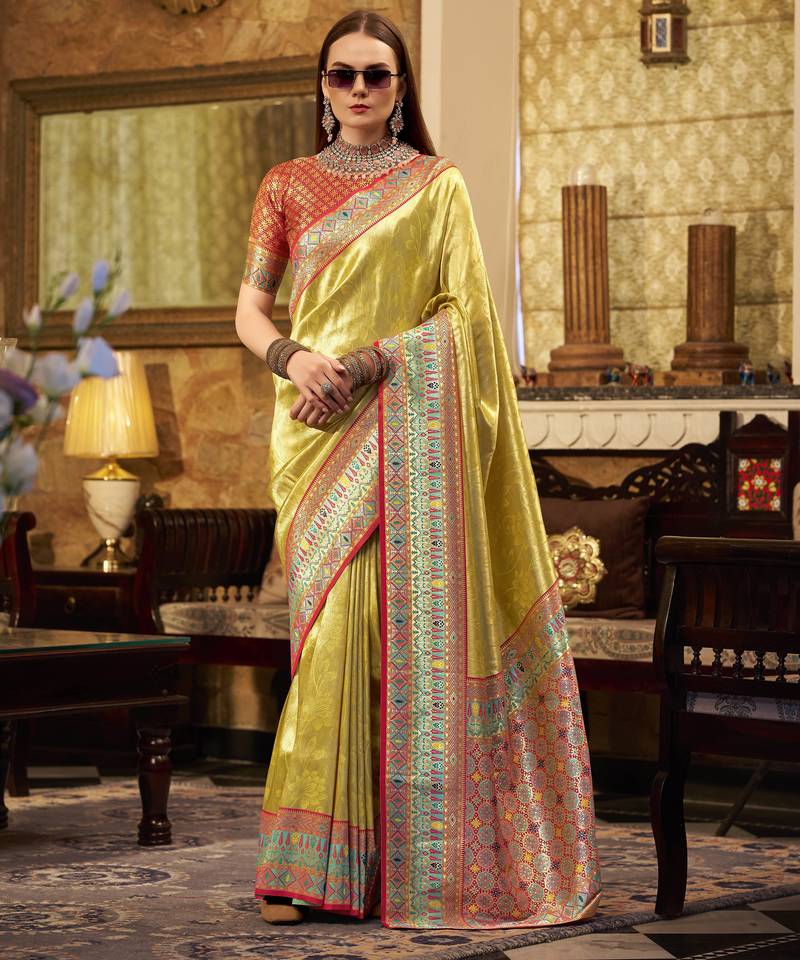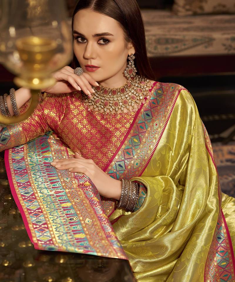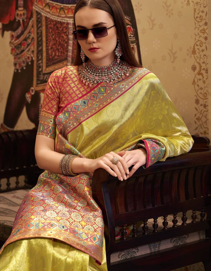 Women's yellow tissue silk zari woven saree with unstitched silk blouse piece