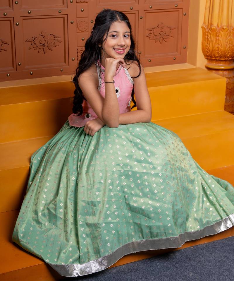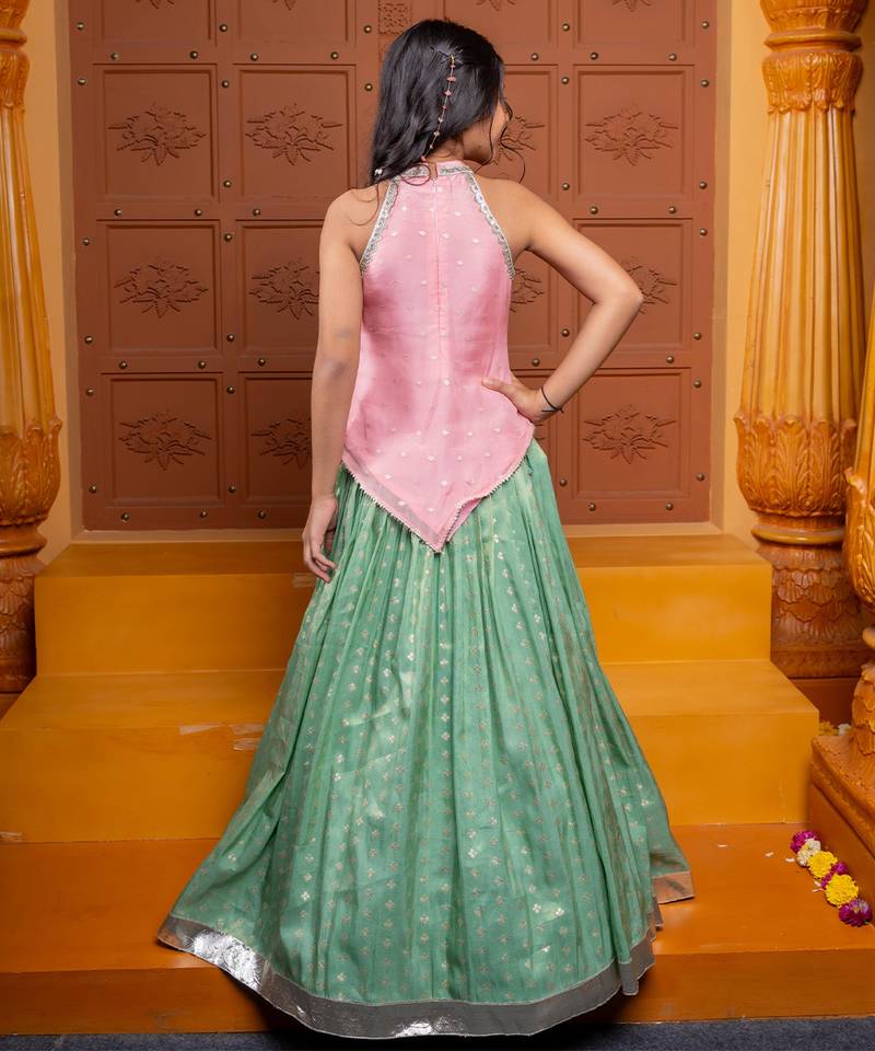 | Product Name | Pink And Green Embroidered Silk Lehenga | |