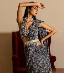 | Product Description | Blue Printed Skirt Saree, Comes With Embroidered Blouse And Belt. The Blouse And Belt Are Embellished With Mirror, Moti And Dabka Work. |