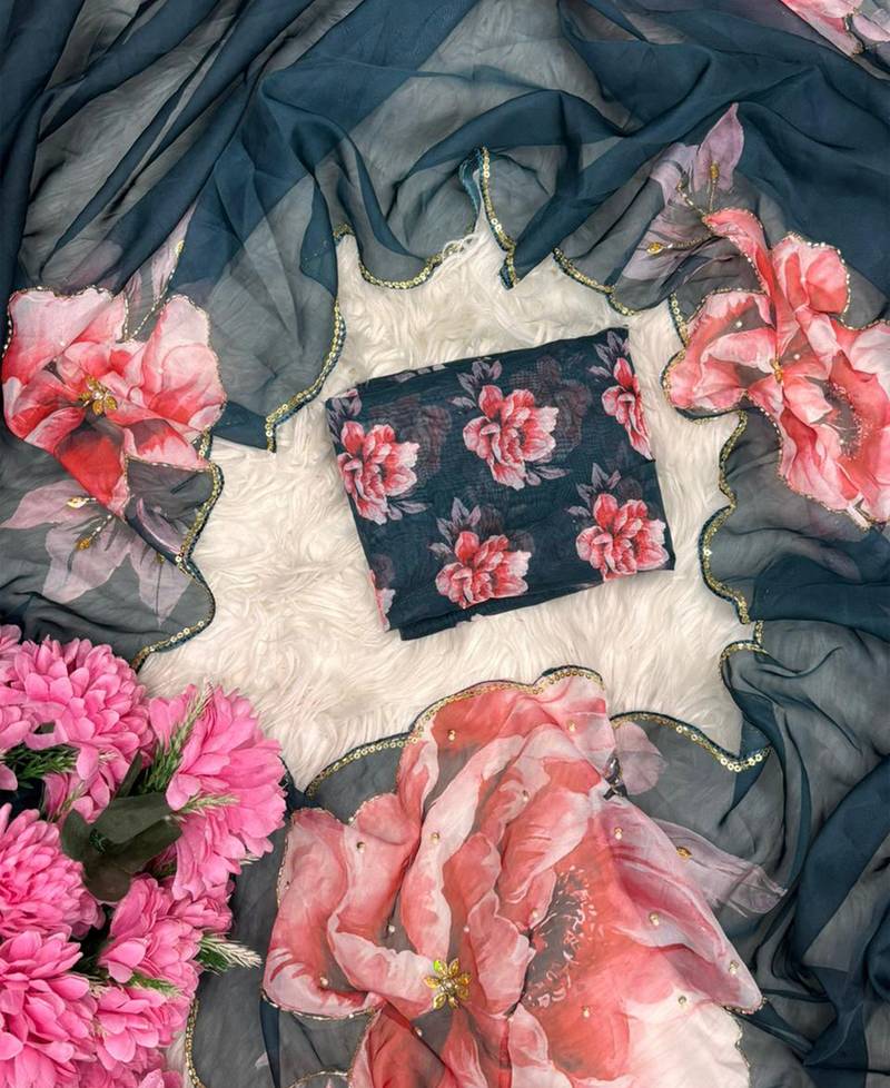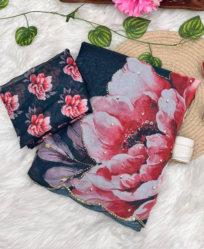 Work Beautiful Floral Print With Hand Embroidery Khatli Work