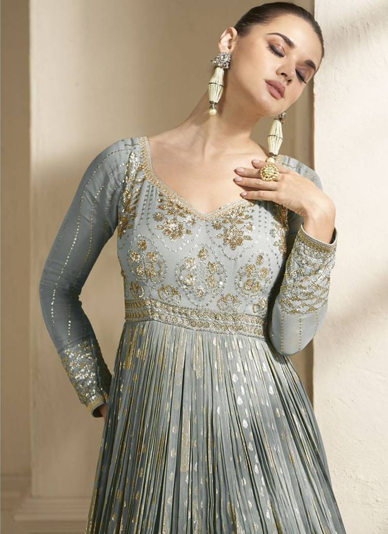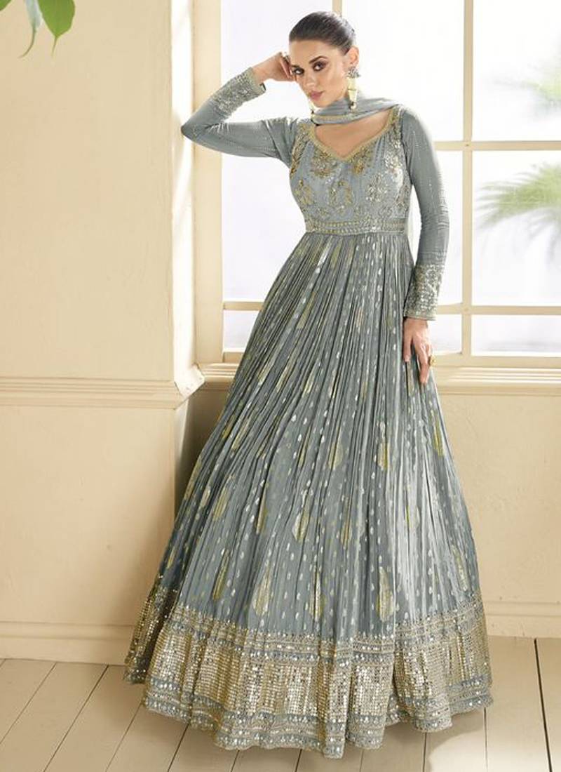 Beautiful grey banarasi silk anarkali suit for women wedding wear semi stitched