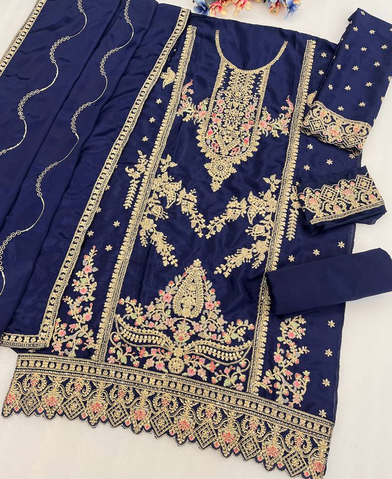 Designer chinon navy blue straight suit for women pakistani style semi stitched