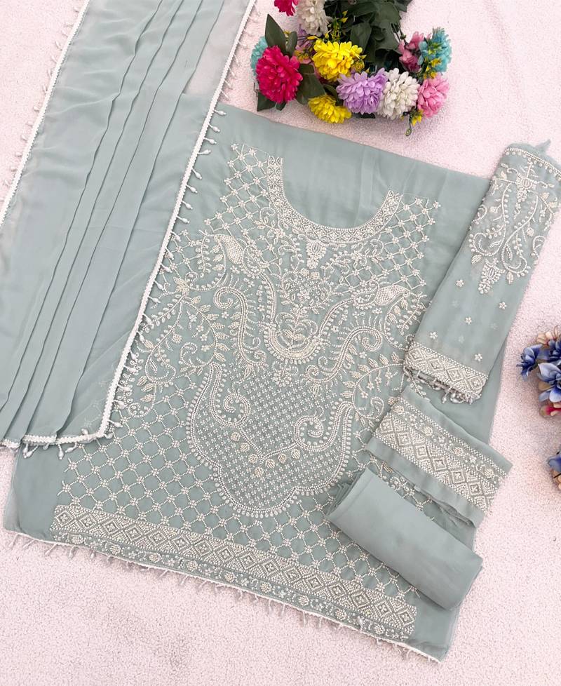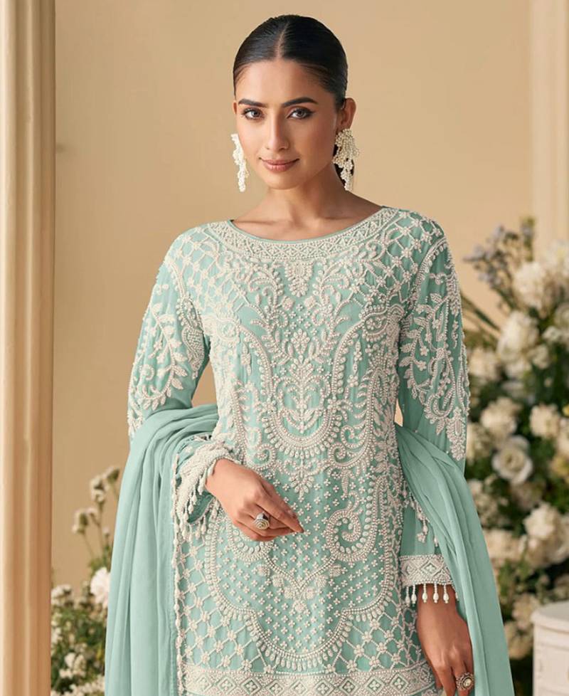 Designer pakistani style sky blue georgette salwar suit for women wedding wear semi stitched