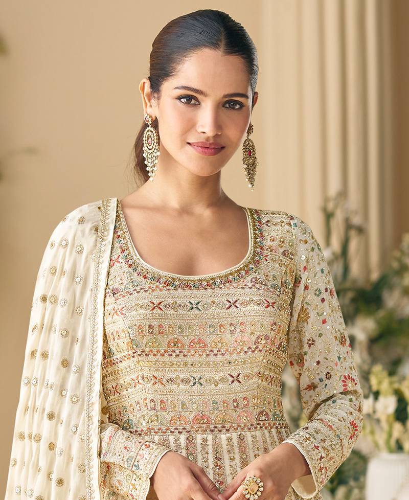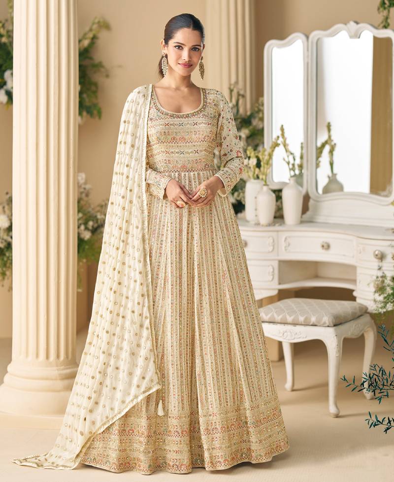 Heavy embroidery worked georgette white anarkali for women wedding wear semi stitched