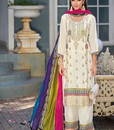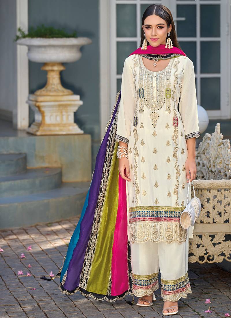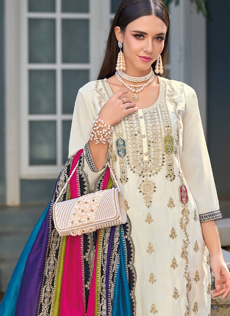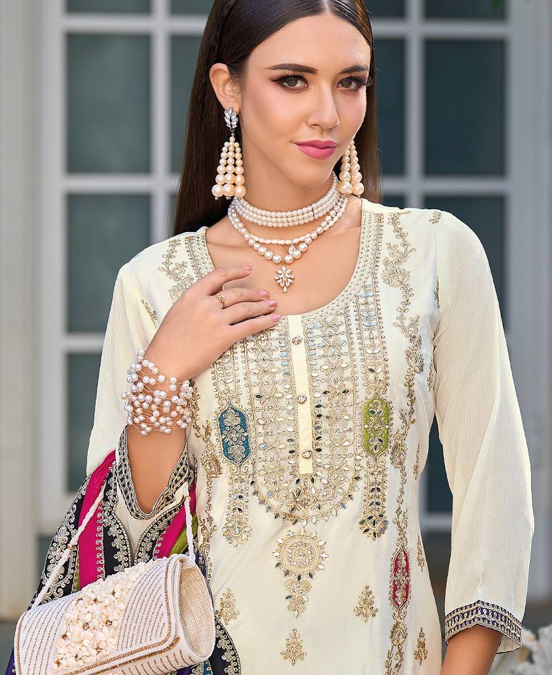 New pakistani straight suit for women chinon fabric white semi stitched
