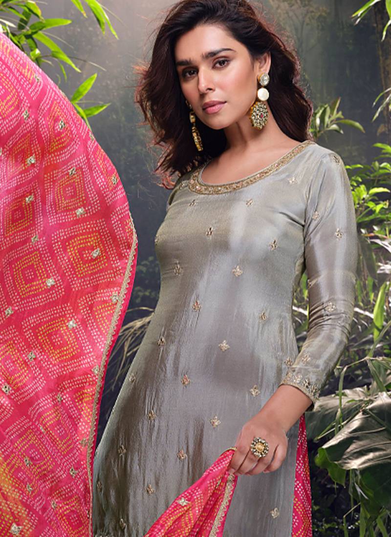 Special party wear simar silk grey gharara suit set for women semi stitched