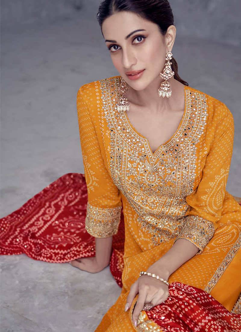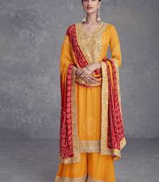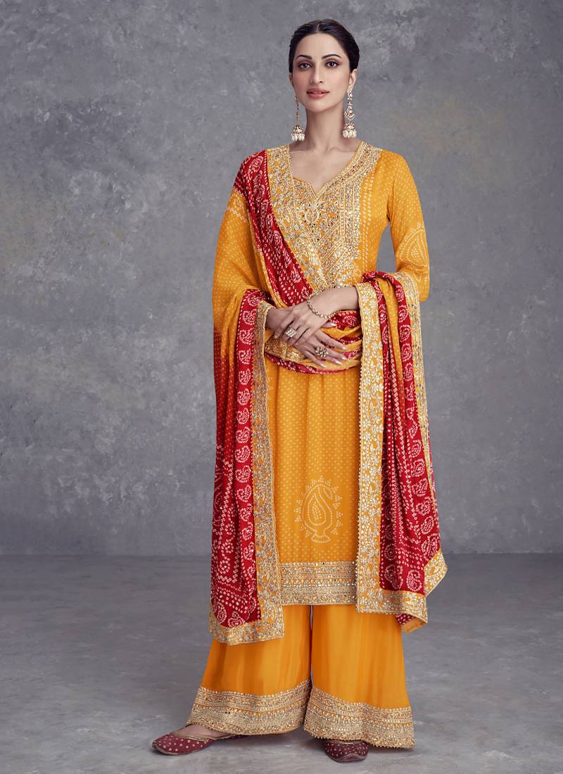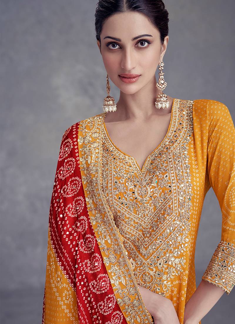 Traditional bandhani printed yellow palazzo suit for women wear semi stitched