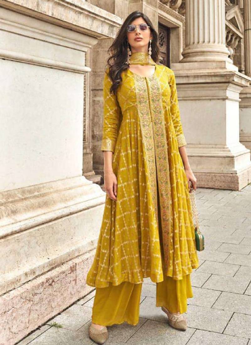 Product Name Trendy Yellow Banarasi Silk Front Slit Anarkali Suit For Women Party Wear