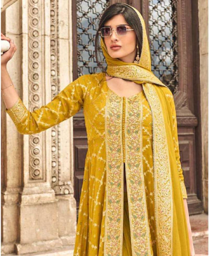 Trendy yellow banarasi silk front slit anarkali suit for women party wear semi stitched