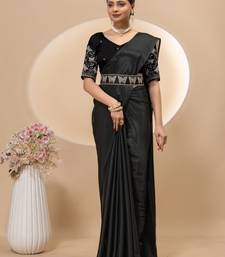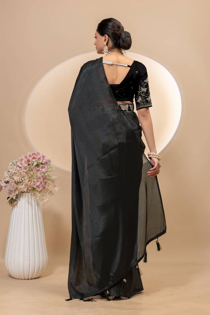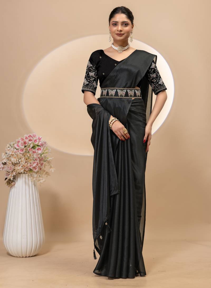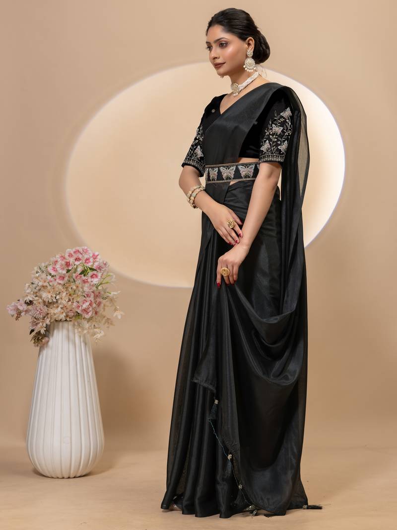 Product Name Black Chinon Silk Saree With Embrodery Work Blouse And Waist Belt