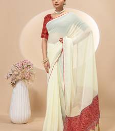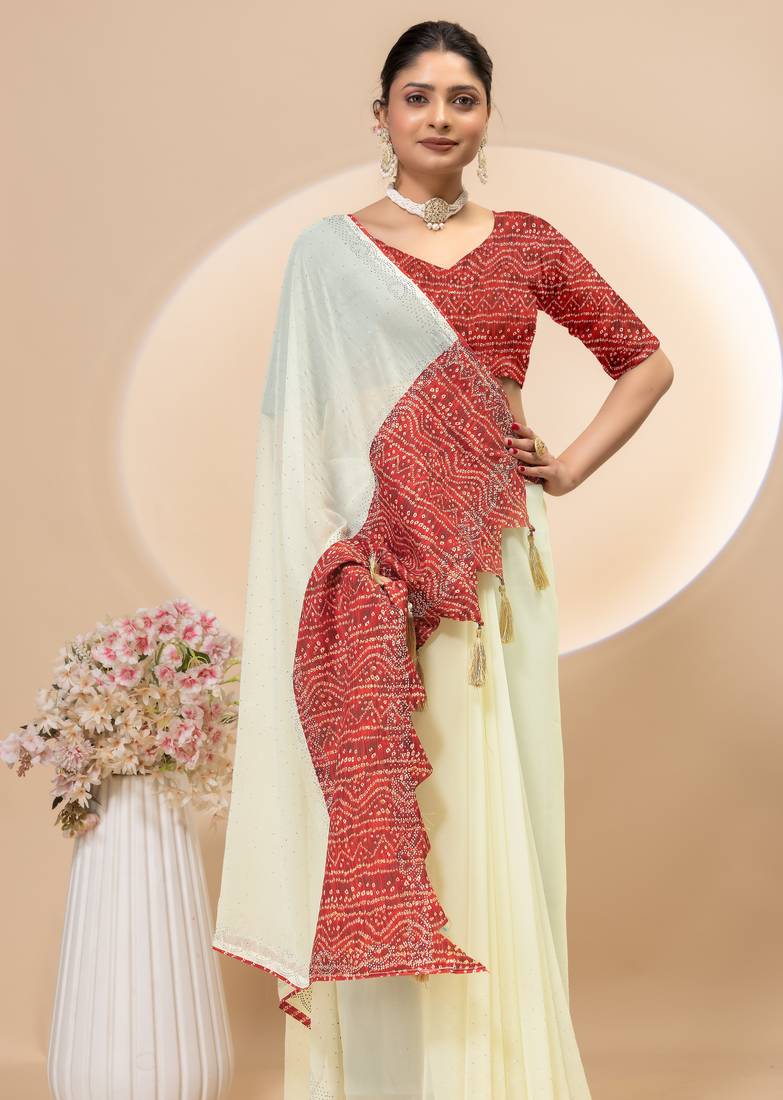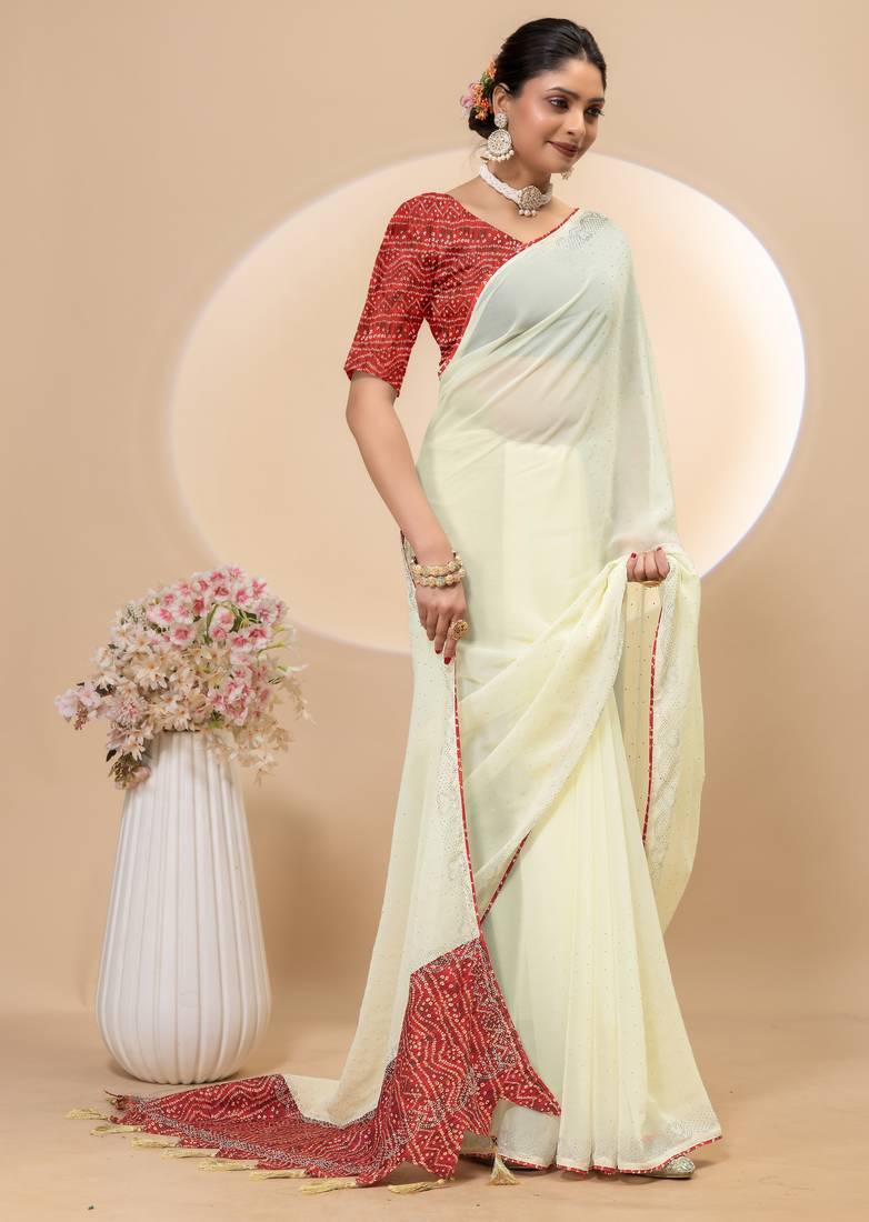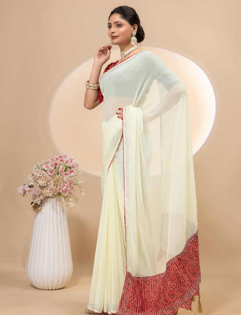 | Product Name | Cream Georgette Saree With Siroski Work And Bandhni Print Pallu And Blouse | |