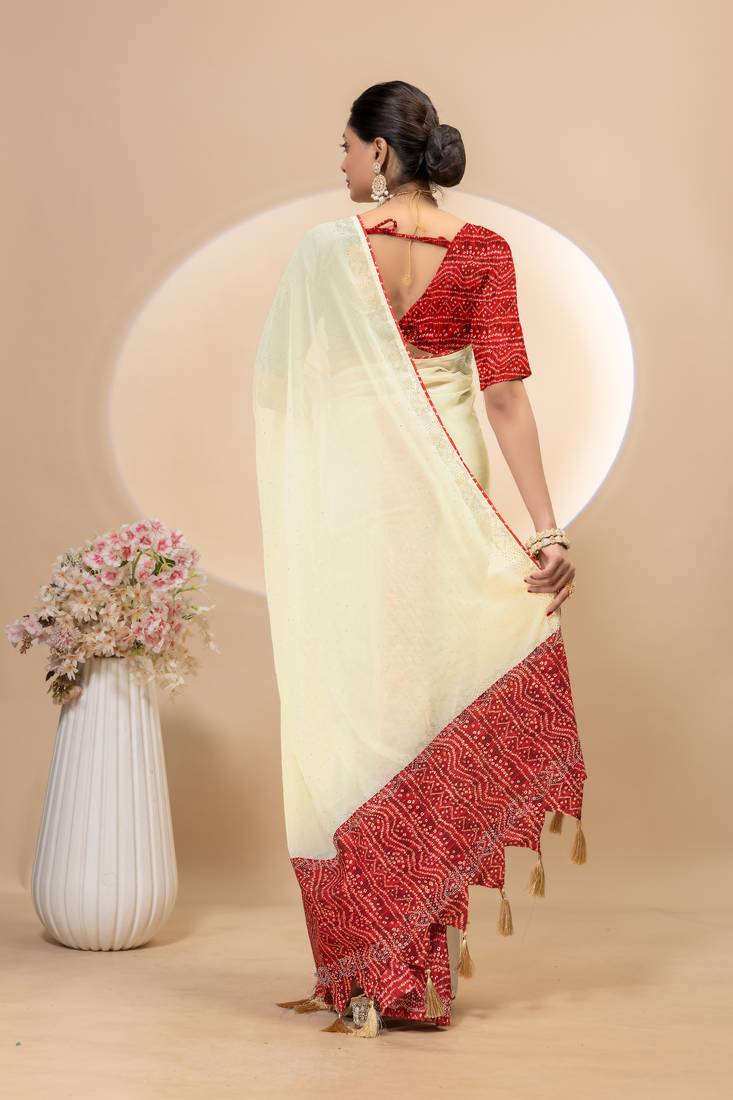 Cream georgette saree with siroski work and bandhni print pallu and blouse
