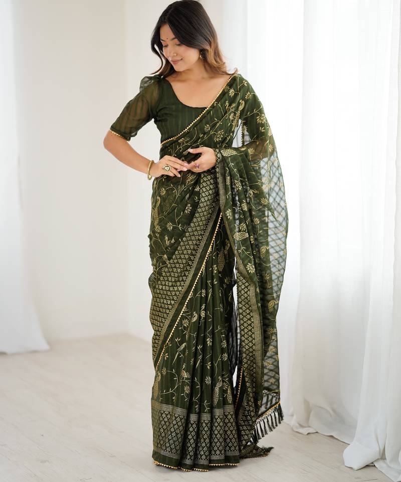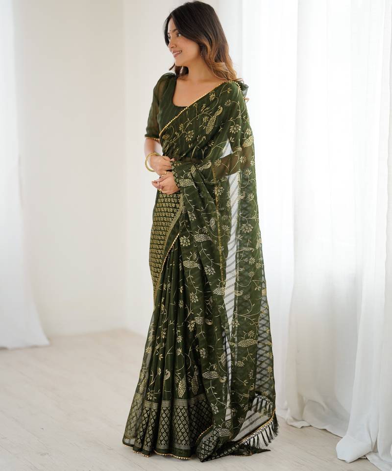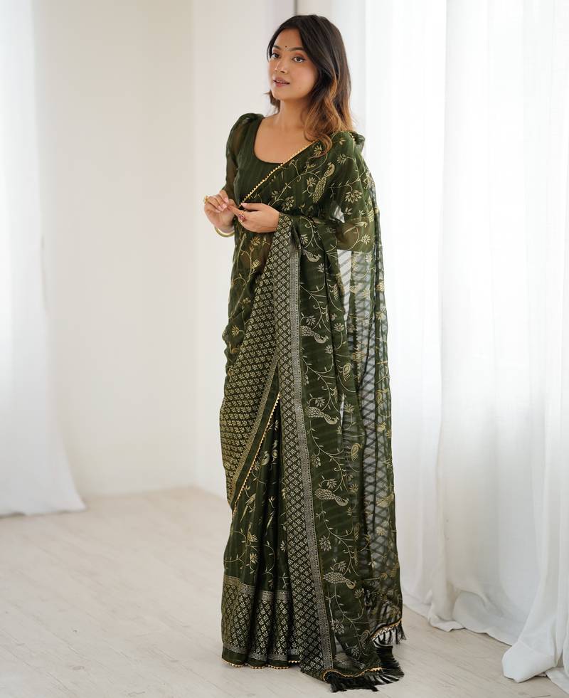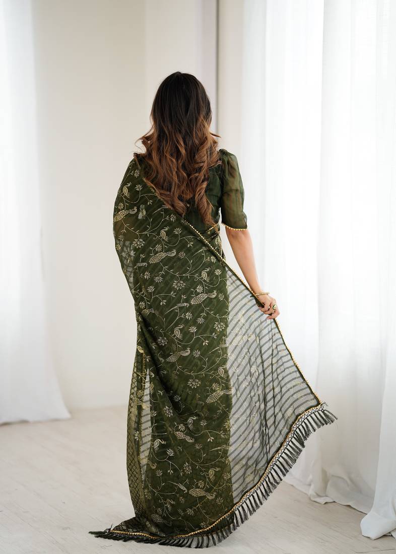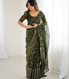• | Saree | : | Color- Mehendi / Fabric- Georgette |