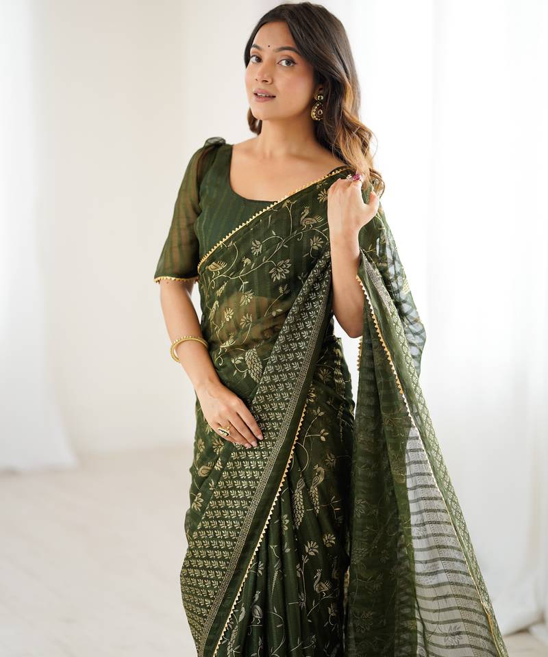 Georgette printed foil work with small zalar lace saree & unstitched blouse piece