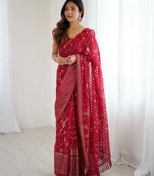 Georgette printed foil work with small zalar lace saree & unstitched blouse piece
