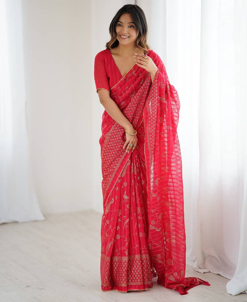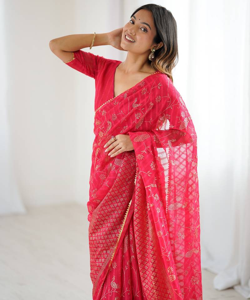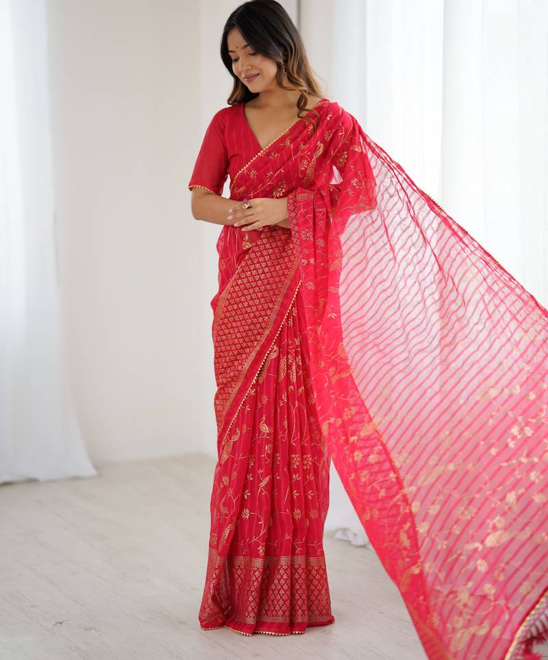 Georgette printed foil work with small zalar lace saree & unstitched blouse piece