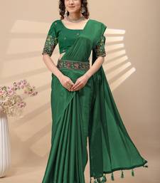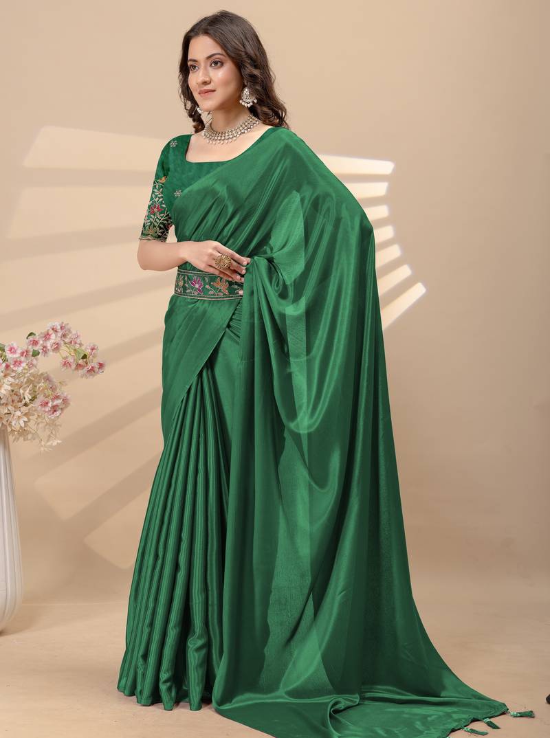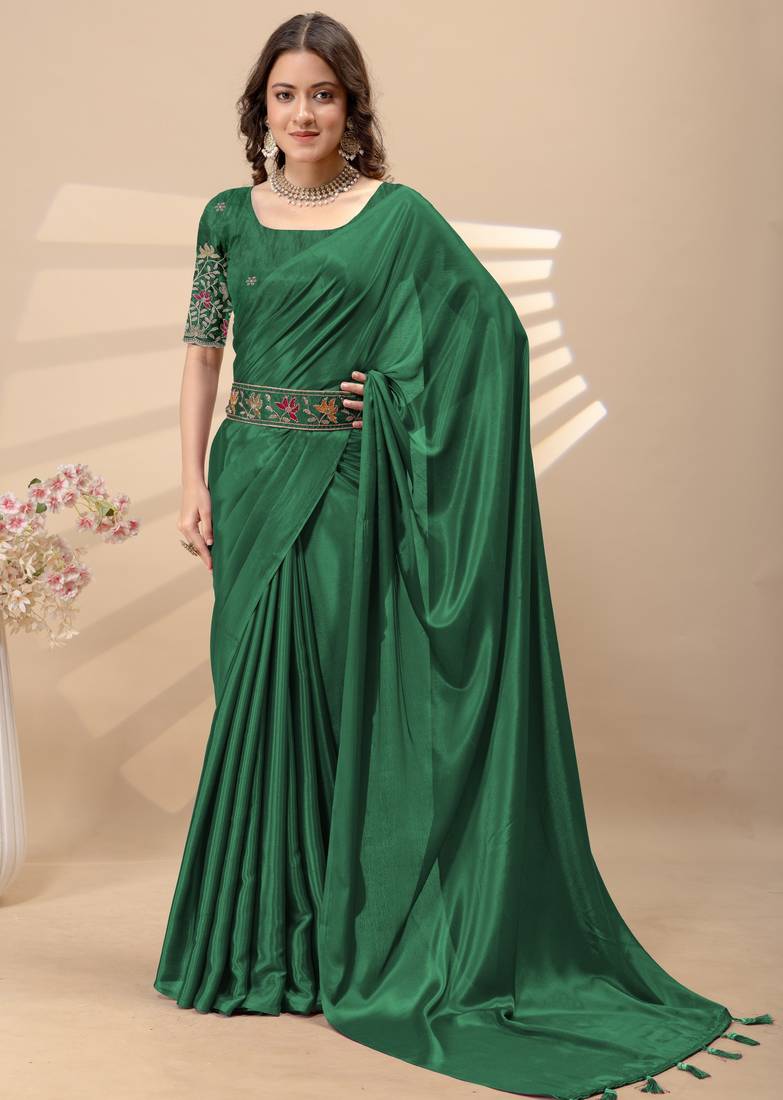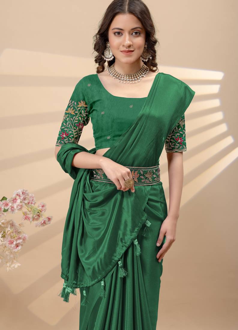 Green chinon silk saree with embrodery work blouse and waist belt