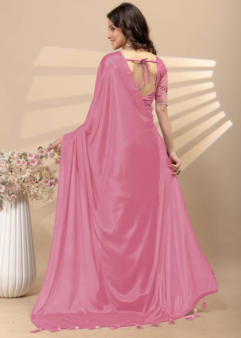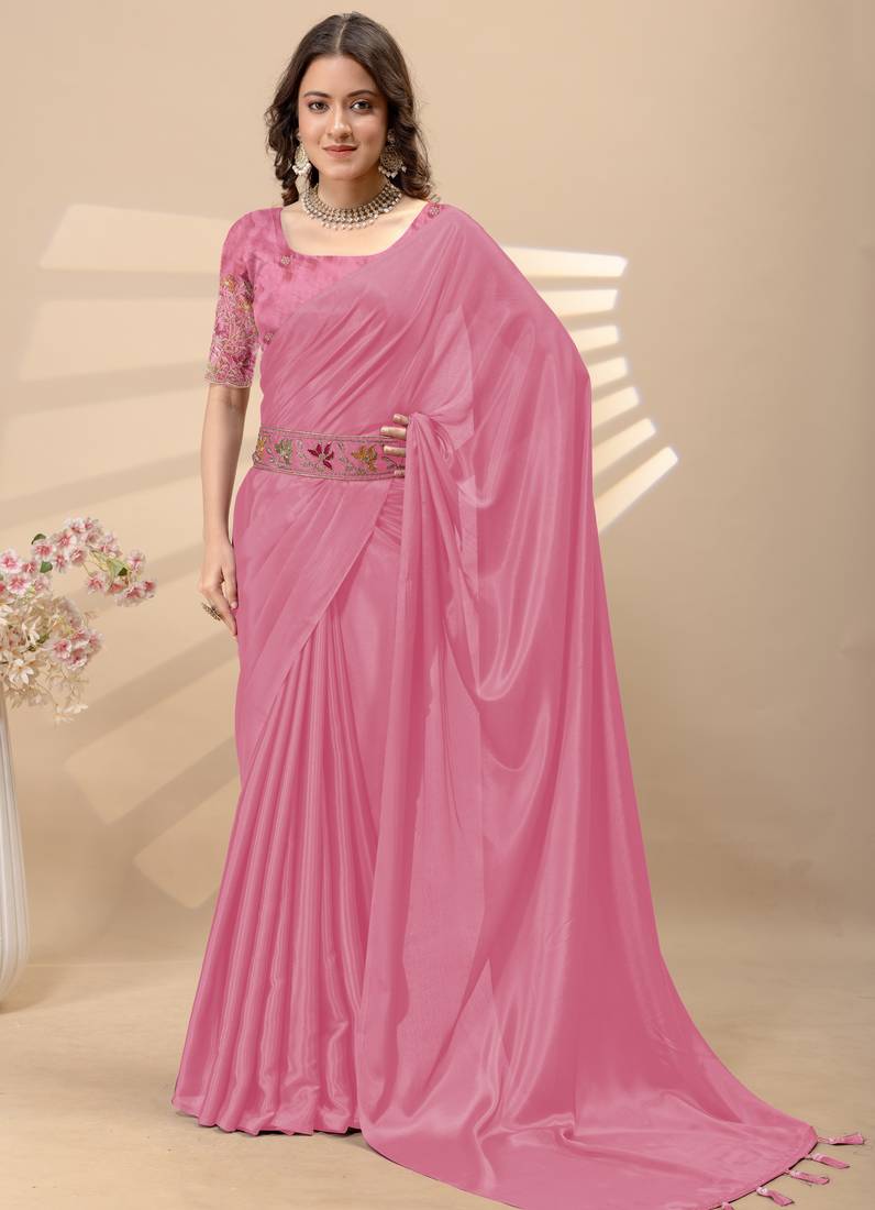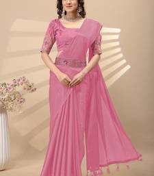 Pink chinon silk saree with embrodery work blouse and waist belt