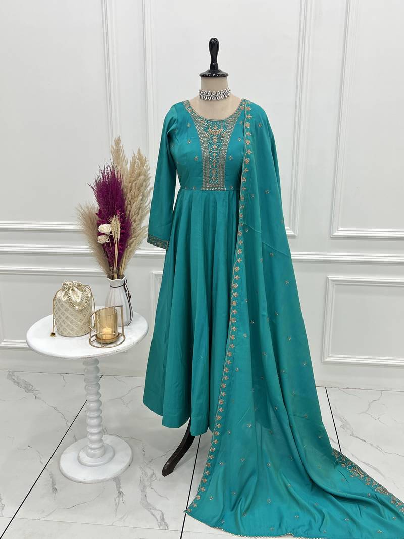 | Product Name | Pure Roman Silk Chanderi Fabric Fully Flair Anarkali Gown With Duppta And Pent Set Ready To Wear | |