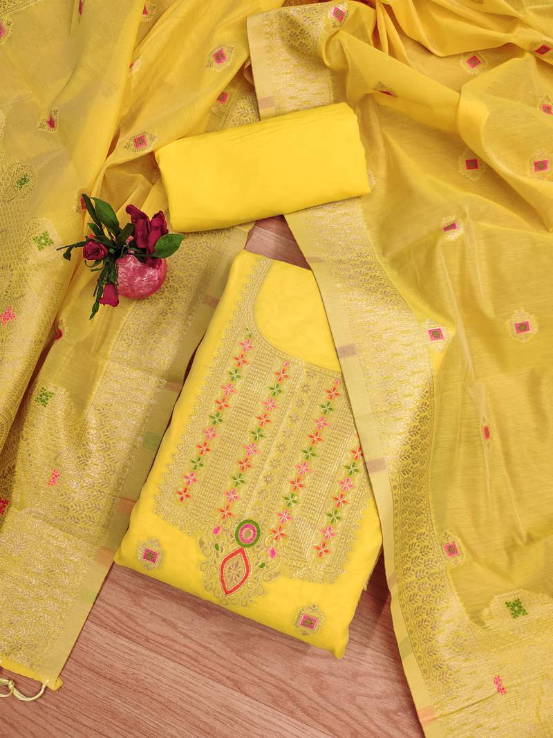 Product Name Un Stitch Dress Materials Pure Chanderi Banarasi Silk Top Soft Cotton Bottom And Woven Chanderi Banarasi Silk Dupatta