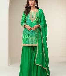 Women green heavy chinon with digital print & embroidery codding sequence work semi stitched