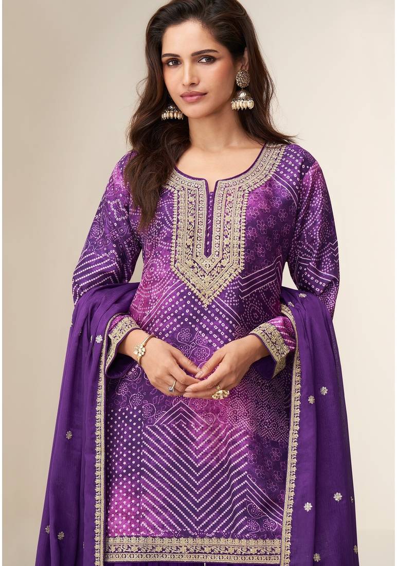 Women violet heavy chinon with digital print & embroidery codding sequence work semi stitched