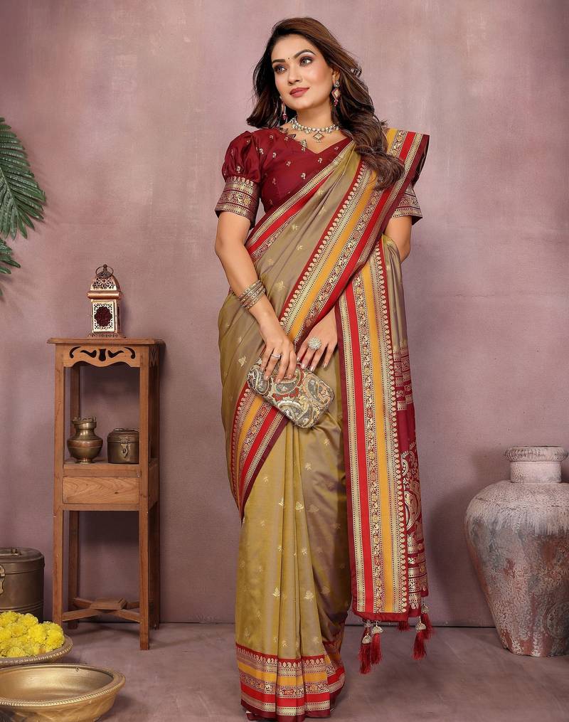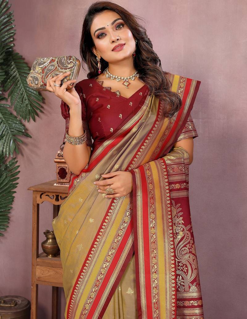 Beige color handloom silk fabric jacquard weaving designer partywear saree