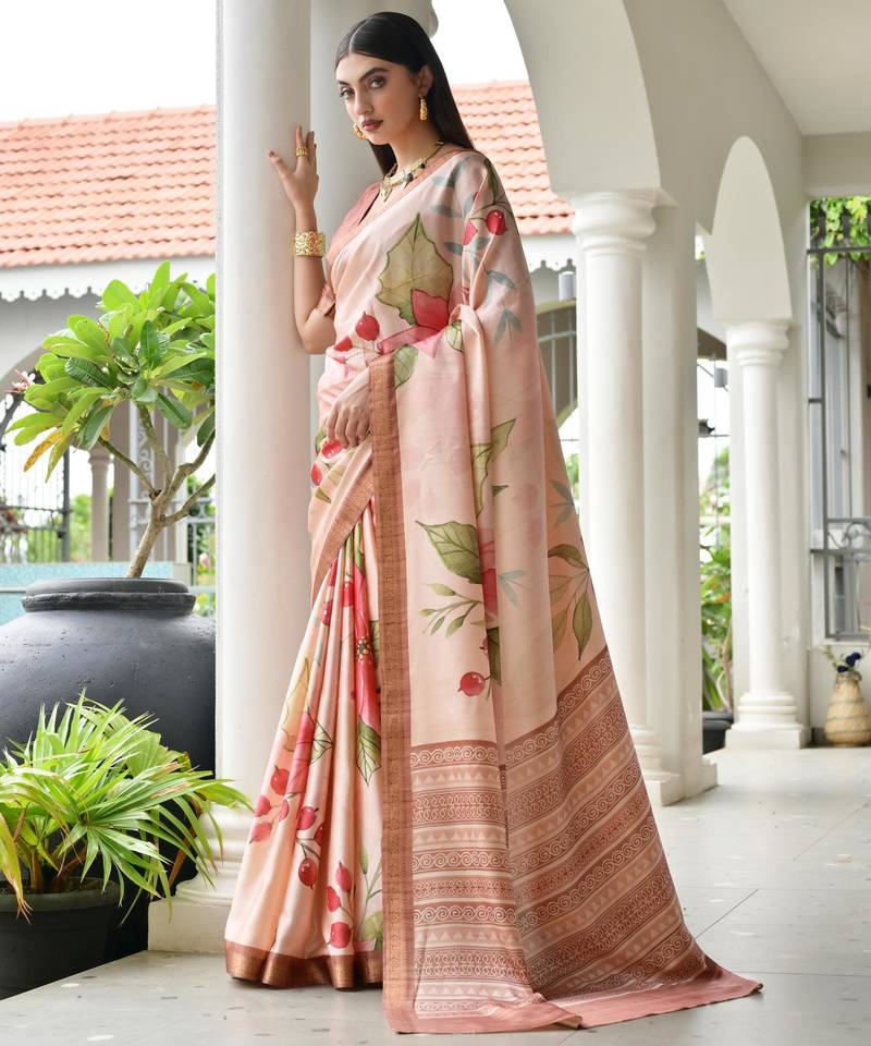 Beige color stylish satin silk blend fabric ethnic partywear saree